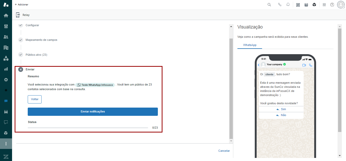 15) Por fim, em Resumo será exibida a confirmação do número de contatos que serão impactados pelo disparo. Clique em Enviar notificações.