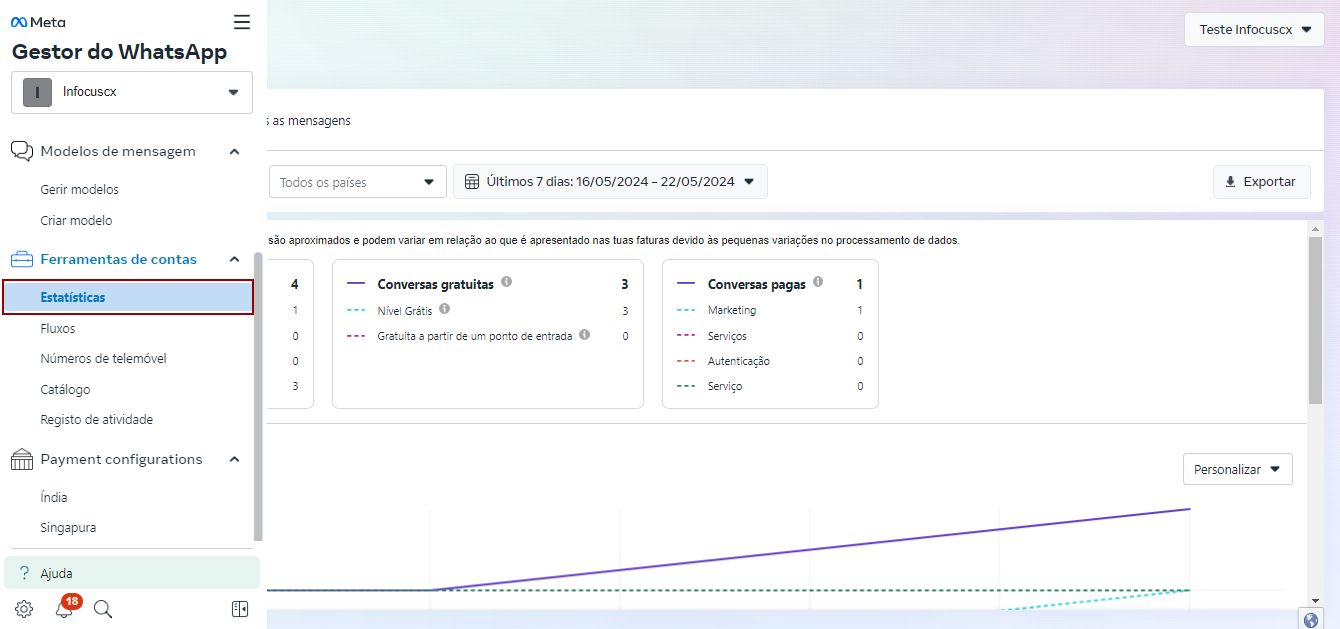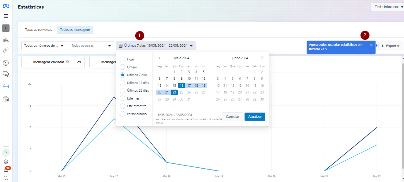 No Gráfico serão exibidos os indicadores Mensagens enviadas e Mensagens entregues que são referentes aos disparos ativos realizados. Já o indicador Mensagens recebidas representa a quantidade de mensagens que o número de WhatsApp em questão recebeu dos clientes que entram em contato, por iniciativa própria.