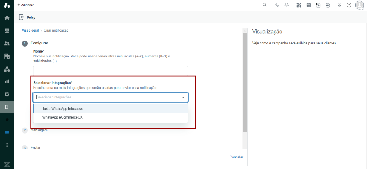 7) Selecione a integração, ou seja, o canal correspondente ao número de WhatsApp que será utilizado para o disparo.