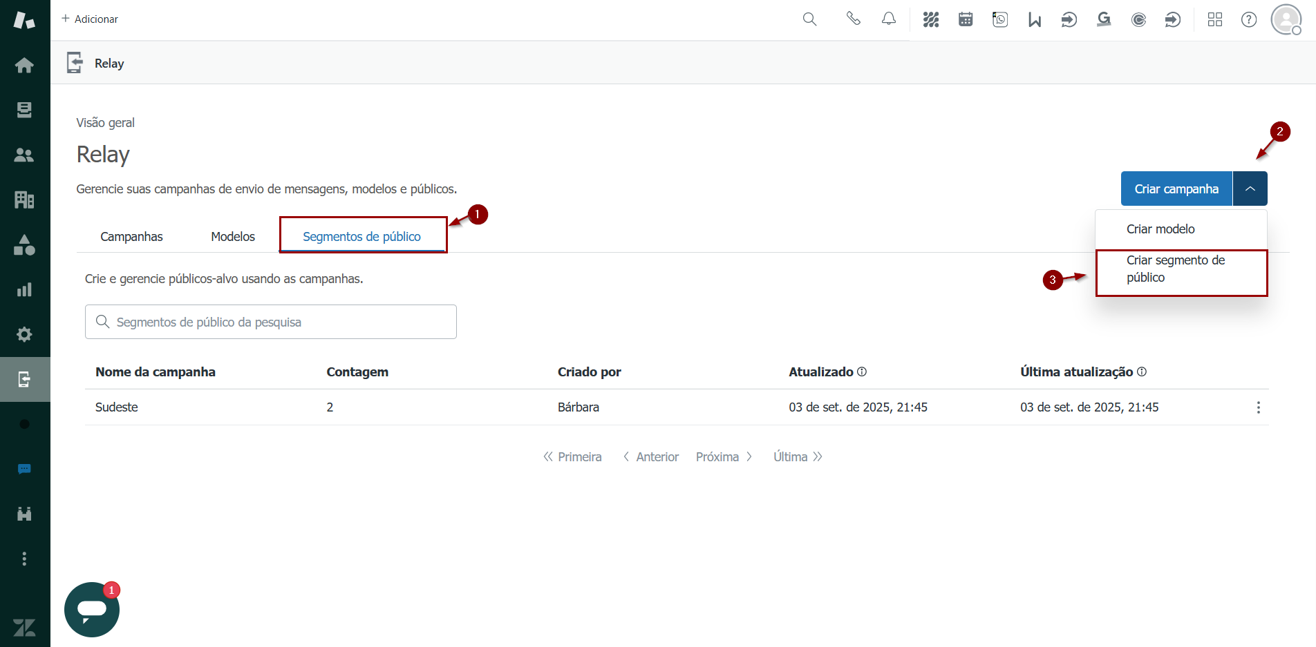 3) Antes de realizar o disparo é importante definir quais usuários serão impactados em cada ação. Clique no menu Segmentos de público (1) para visualizar os segmentos já criados. Para criar novos agrupamentos de usuários, clique na seta (2) e selecione criar segmento de público (3).