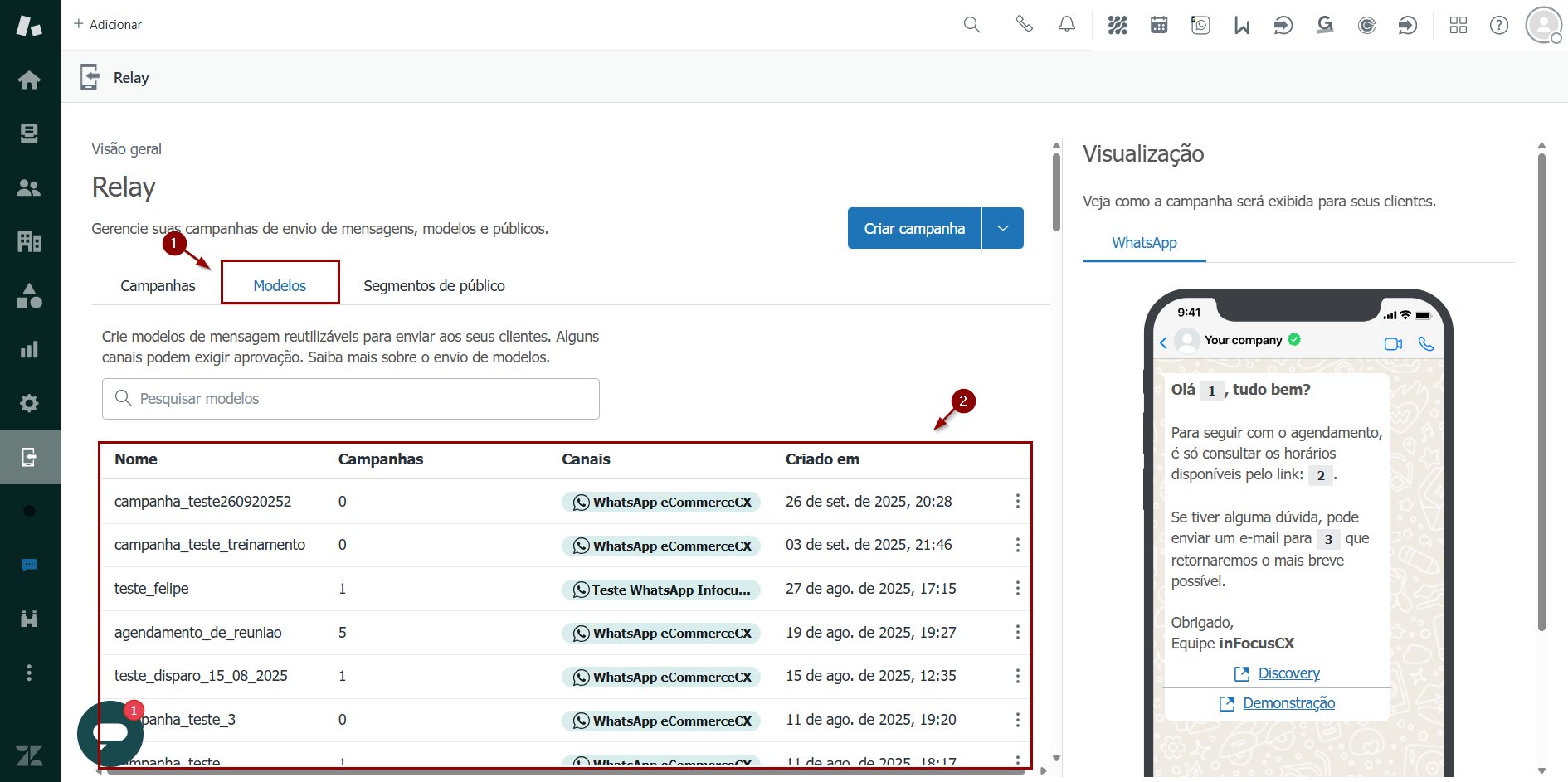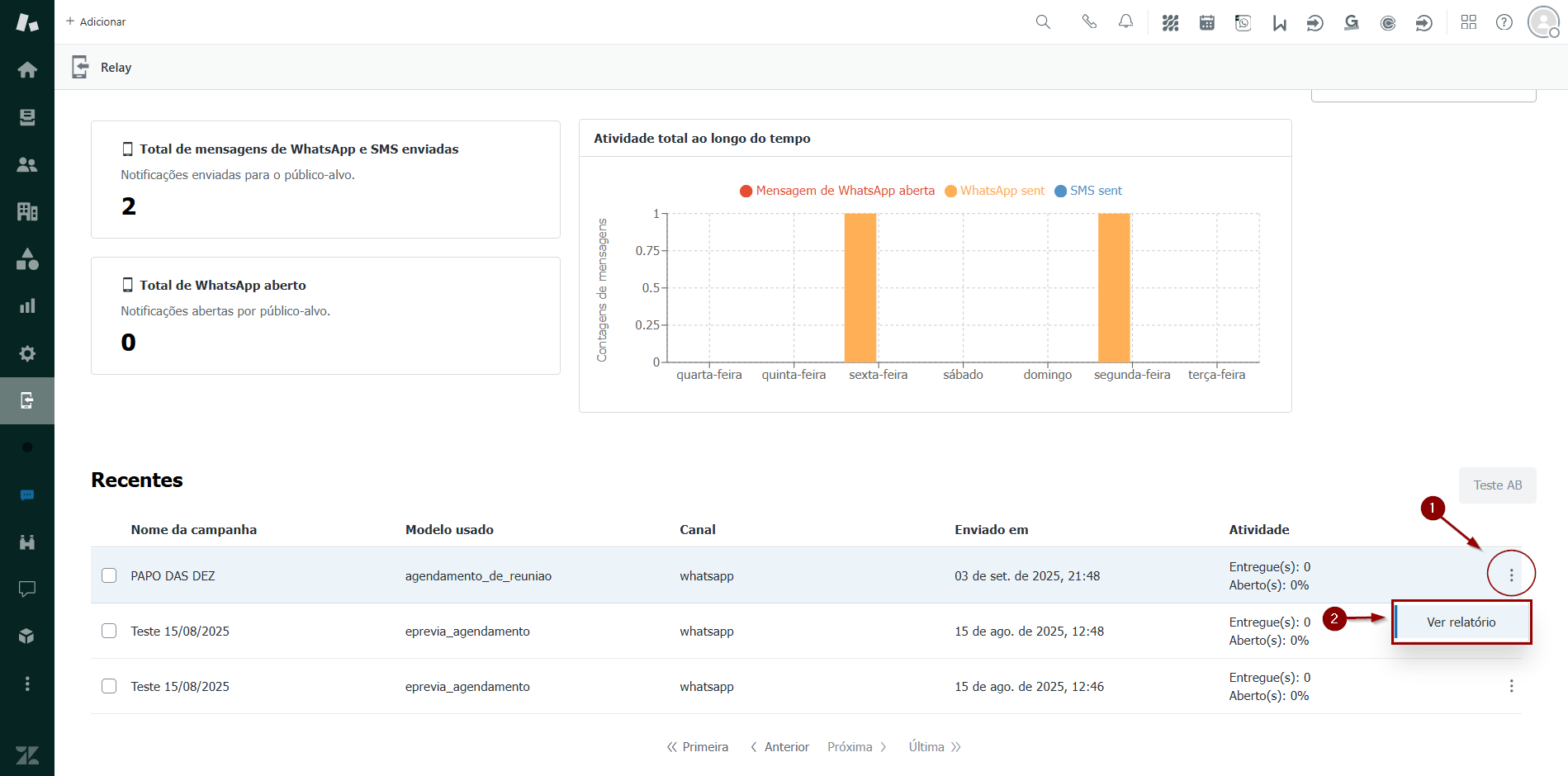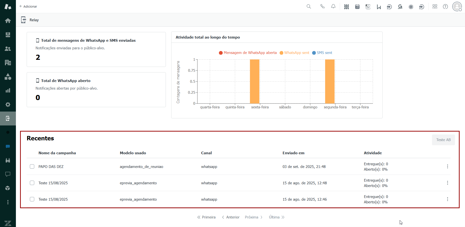2) Abaixo dos indicadores, serão listadas as campanhas disparadas, conforme o nome, modelo usado, canal, data do disparo e atividade (percentual entregue e aberto).