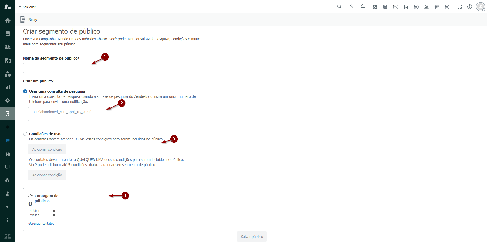 4) Defina o nome do segmento de público (1) e crie um público (2), conforme as opções apresentadas. A primeira forma é a partir de uma consulta específica (3), seja uma tag ou número de telefone específico. Já a segunda é por meio da definição das condições de uso todas e qualquer (4). Ao término da definição critérios, o campo contagem de públicos (4) retornará com a quantidade de usuários do segmento criado.