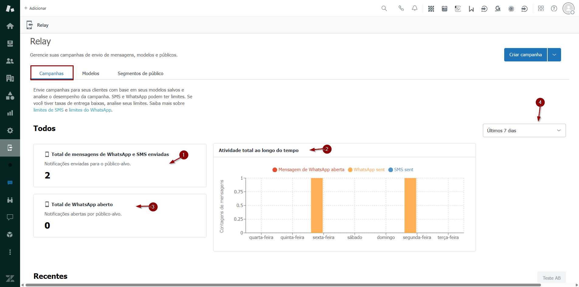 1) Os dados das campanhas enviadas são apresentados, conforme o total de mensagens e WhatsApp/SMS enviadas (1), a atividade total ao longo do tempo (2) e o total de WhatsApp aberto (3). É possível filtrar essas métricas (4), considerando a janela dos últimos 7 dias, últimos 30 dias e últimas 24 horas.