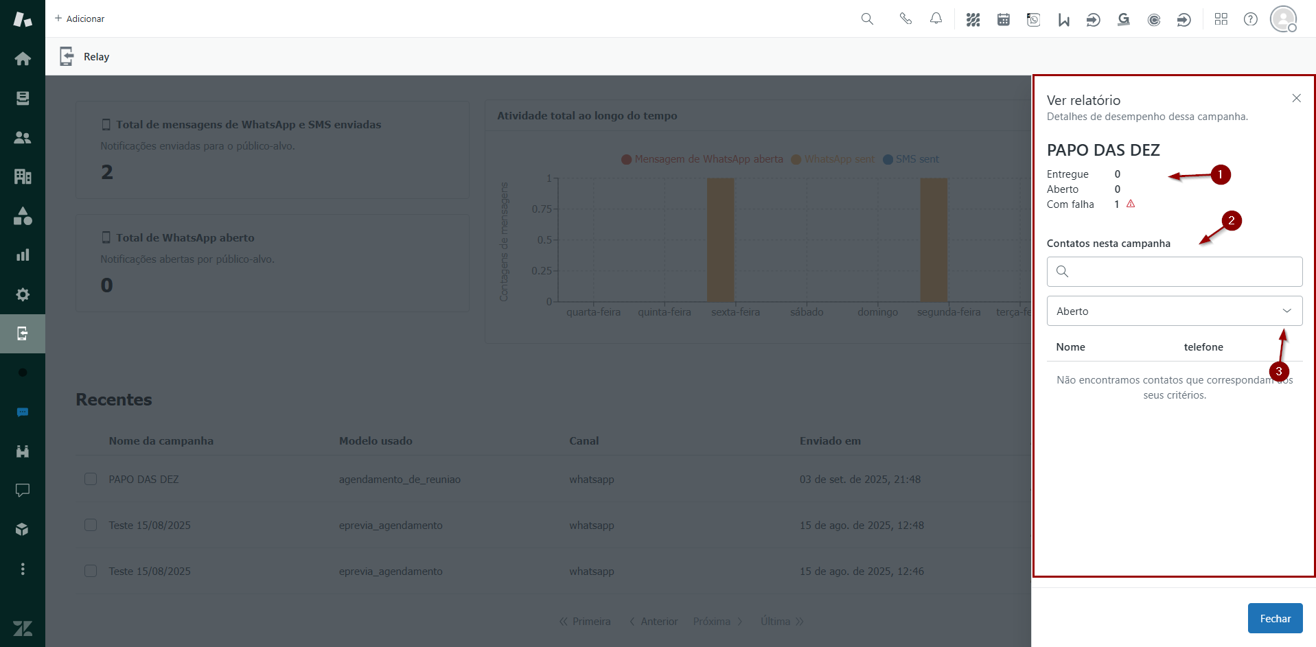4) O Relatório da campanha irá apresentar a quantidade de mensagens entregues, abertas e com falha (1). É possível filtrar contatos na campanha (2) ou pelo status (3).
