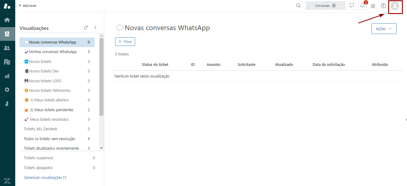 1) Na instância Zendesk, clique no menu de acesso ao Perfil.