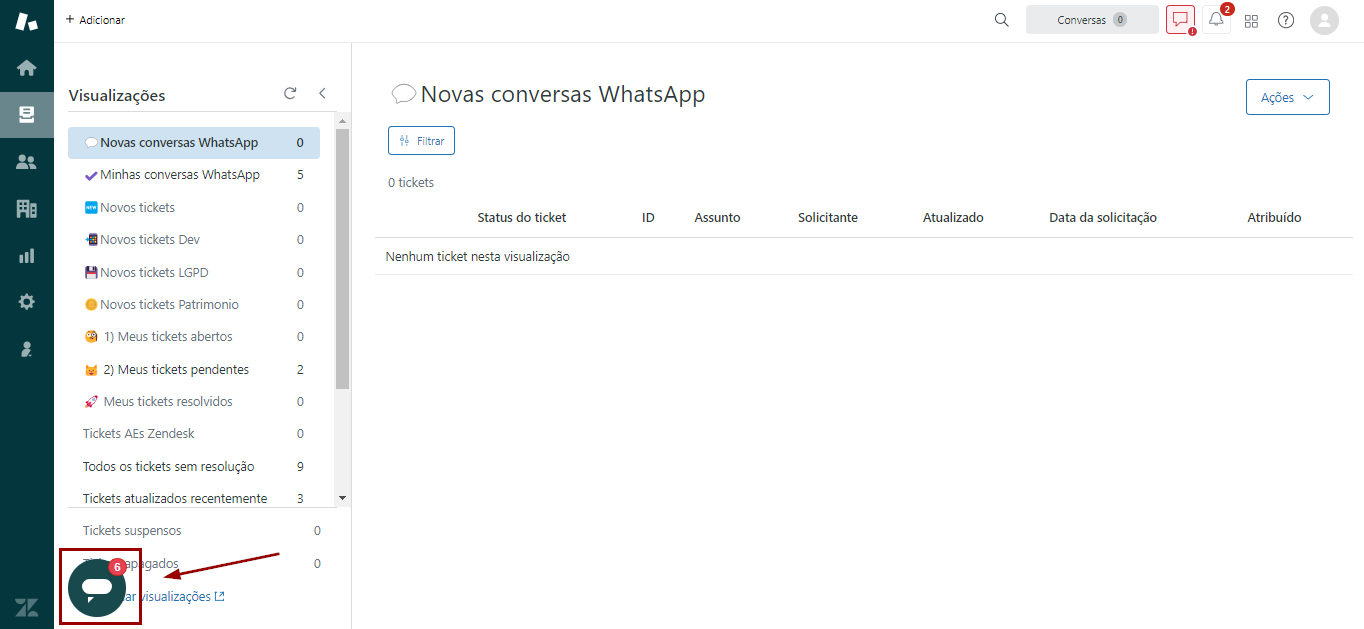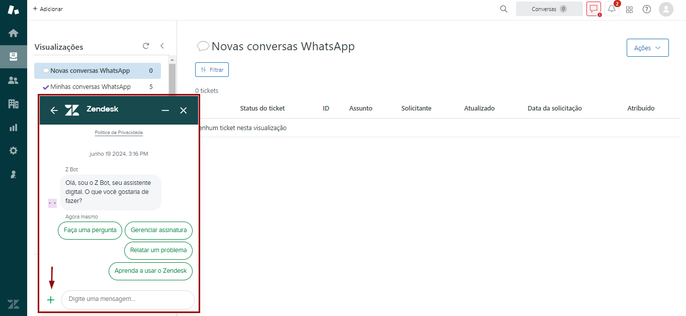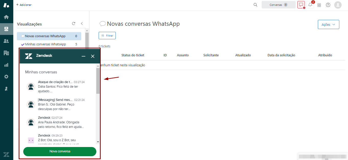 3) Será exibida a janela para iniciar uma conversa com a Zendesk. Clique em Nova conversa.