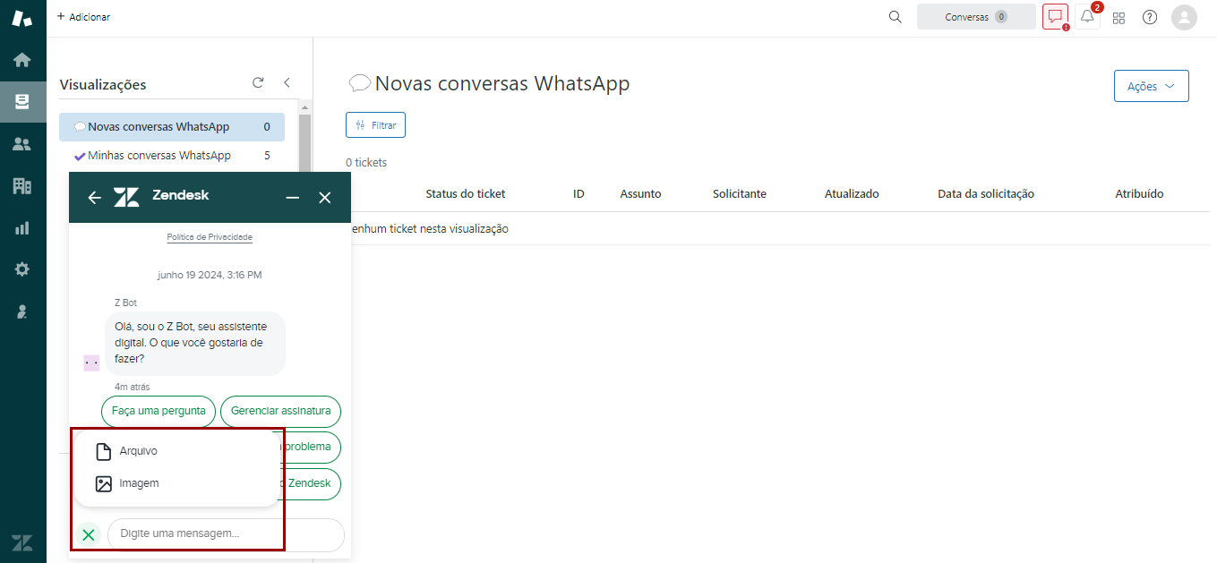 1) No web widget da conversa: O alerta sobre atualizações no chamado pode ser exibido no próprio web widget em que a conversa foi iniciada.