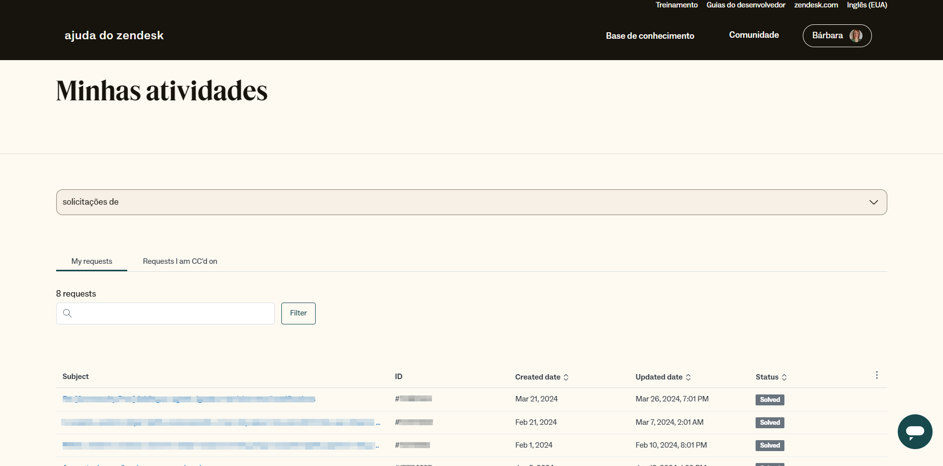 Cada membro de equipe irá visualizar a relação completa das solicitações registradas a partir de sua credencial, e também nas que seu usuário foi inserido em cópia. Os tickes serão exibidos conforme assunto, ID, data de criação, data de atualização e status.
