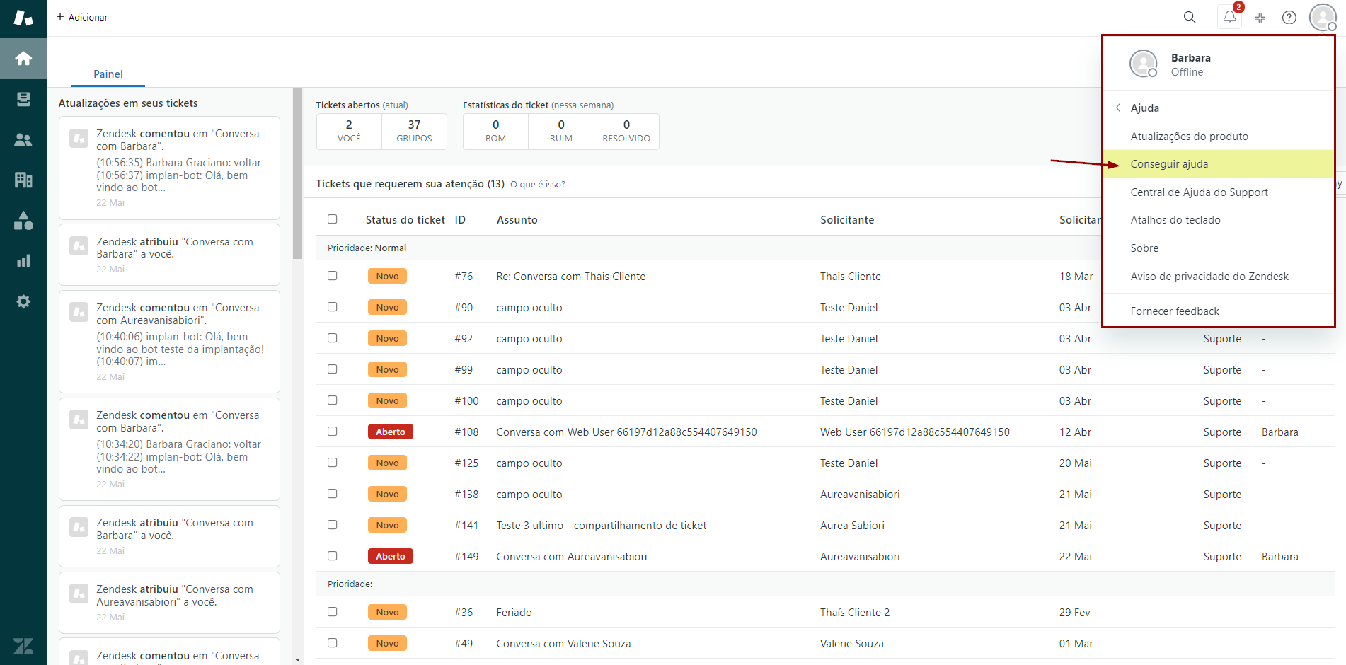 A opção Conseguir ajuda está disponível no menu Perfil de todos os membros de equipe, e por isso, todos os colaboradores que ocupam uma credencial na Zendesk conseguem iniciar uma nova conversa com a equipe de Suporte da Zendesk.