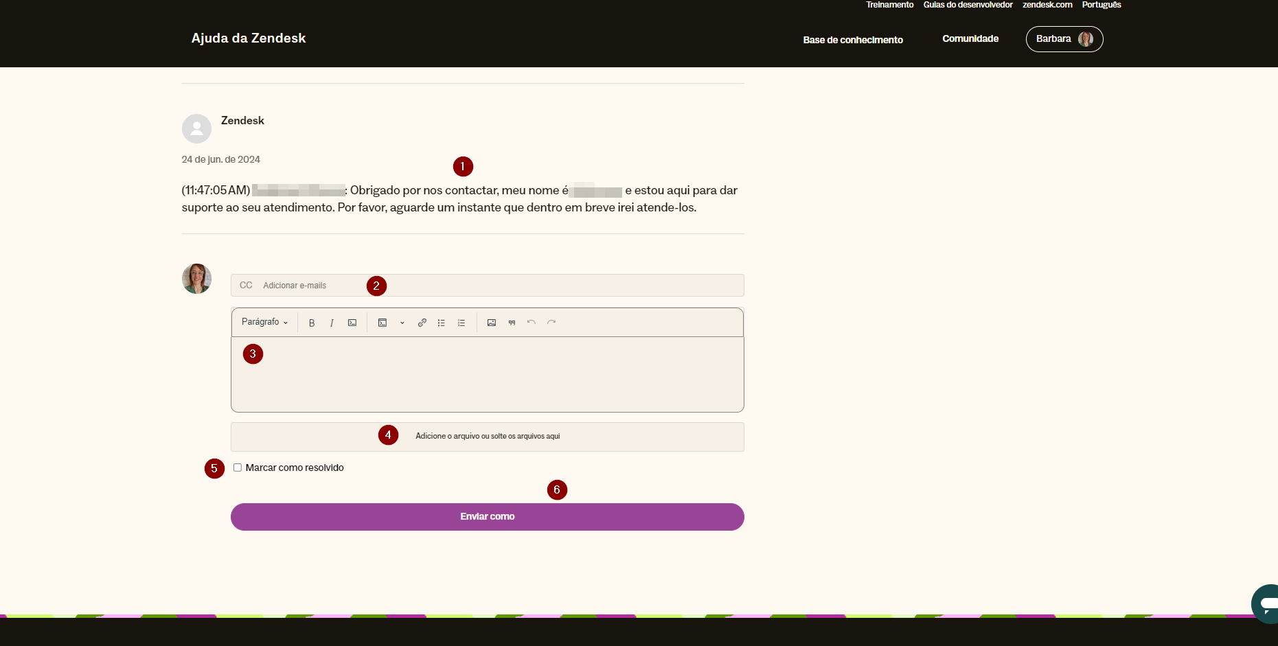 Basta clicar no assunto do chamado em questão para visualizar o histórico de interação (1), considerando o percurso pelo bot, o transbordo e as trocas de mensagens com a equipe de suporte. No ticket de suporte também será possível inserir outros usuários em cópia (2), e utilizar a caixa de mensagem para enviar mensagens (3), inserir novos anexos (4), marcar o ticket como Resolvido (5) e utilizar o botão para Enviar como (5).