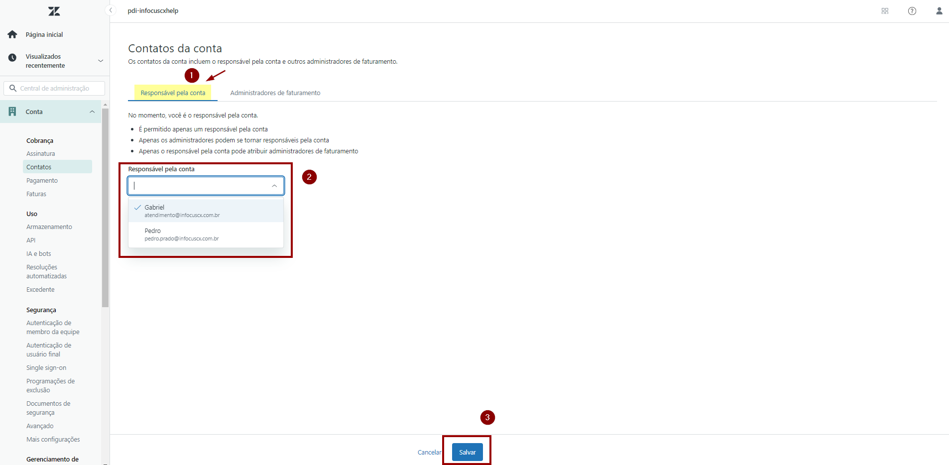 3) No menu Responsável pela conta (1) será exibido o nome do membro de equipe responsável por essa função. Caso seja necessário promover a alteração do nome, clique na seta (2) e, por fim, clique no botão Salvar (3).