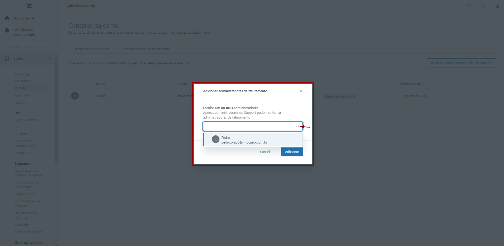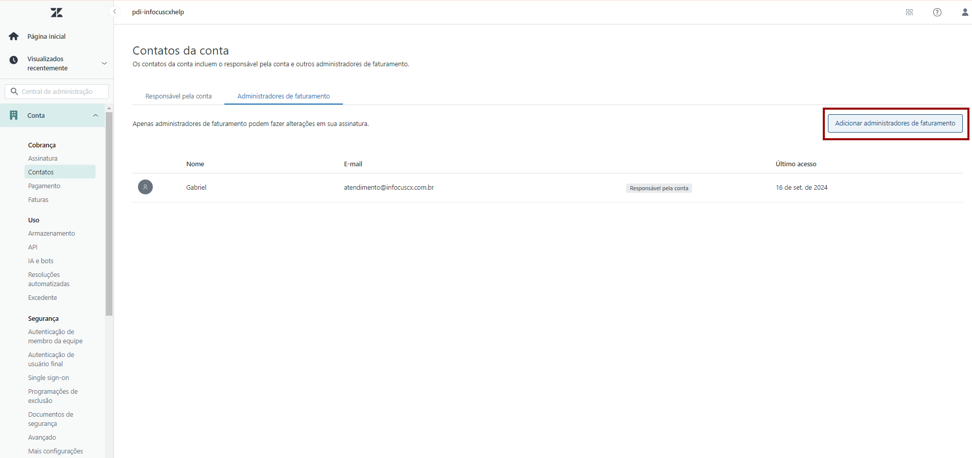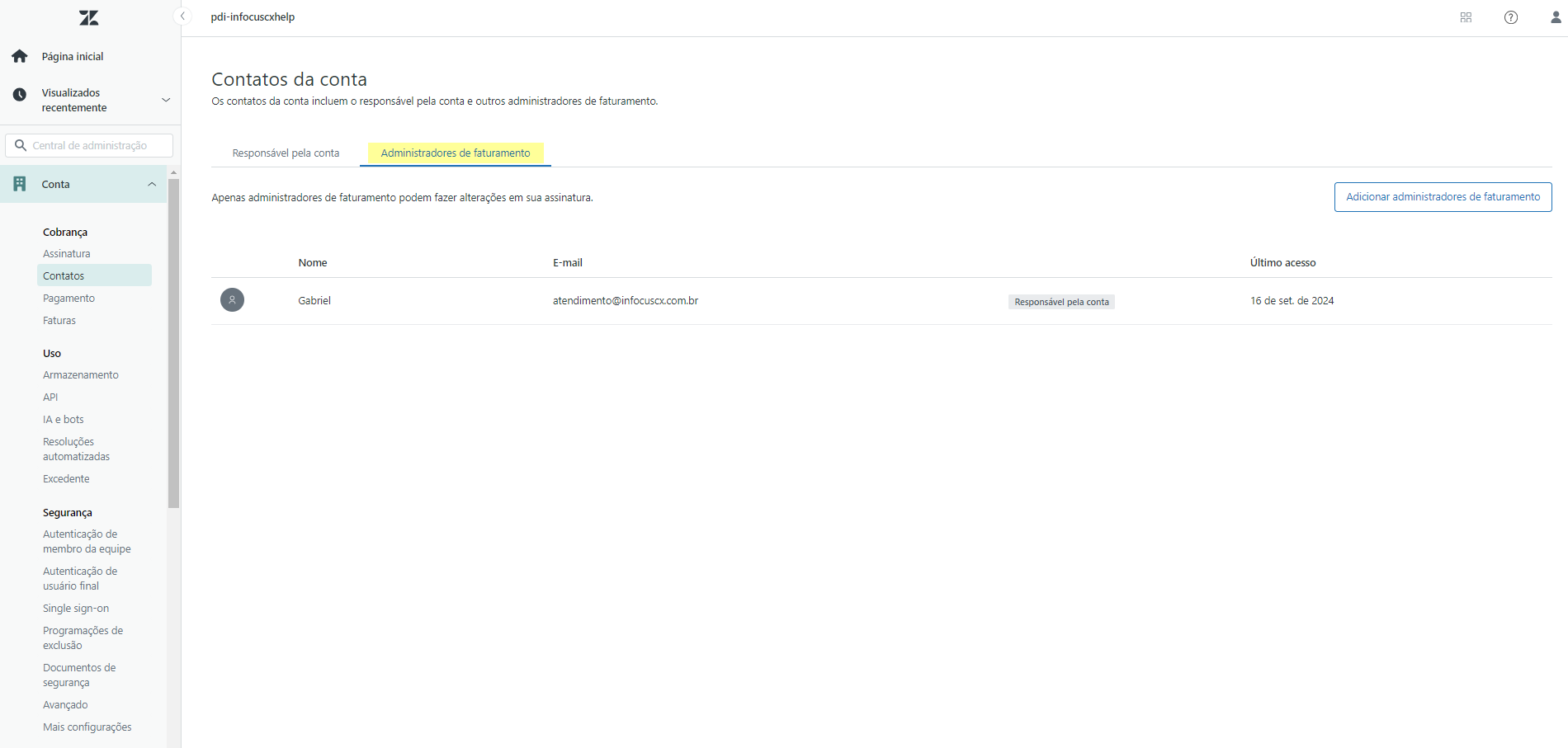 6) Para visualizar o membro de equipe responsável questão financeira ligada à assinatura da Zendesk, clique no menu Administradores de faturamento.