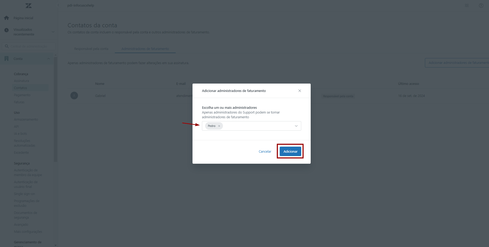 9) Ao selecionar o(s) nome(s) do(s) administrador(es) da conta, cada um deles será indicados na tela. Para confirmar, clique em Adicionar.