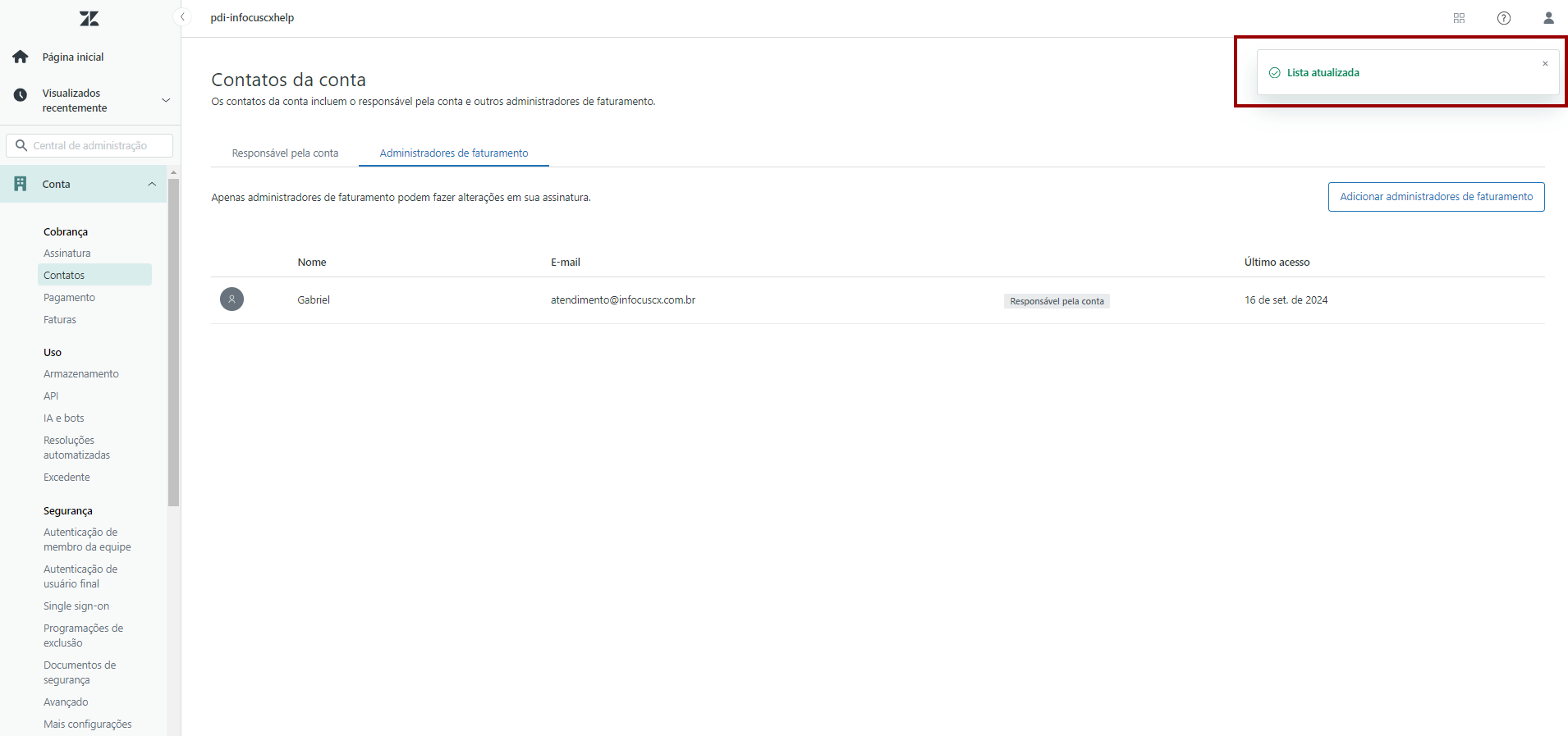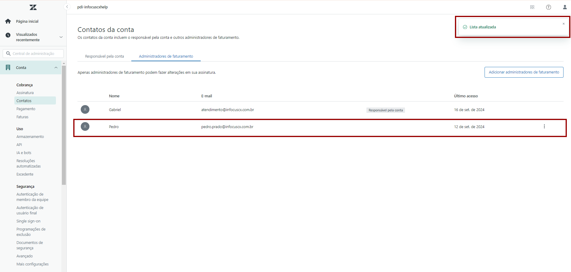 10) A notificação de atualização da lista será exibida, e o nome do novo administrador de faturamento será exibido na lista.