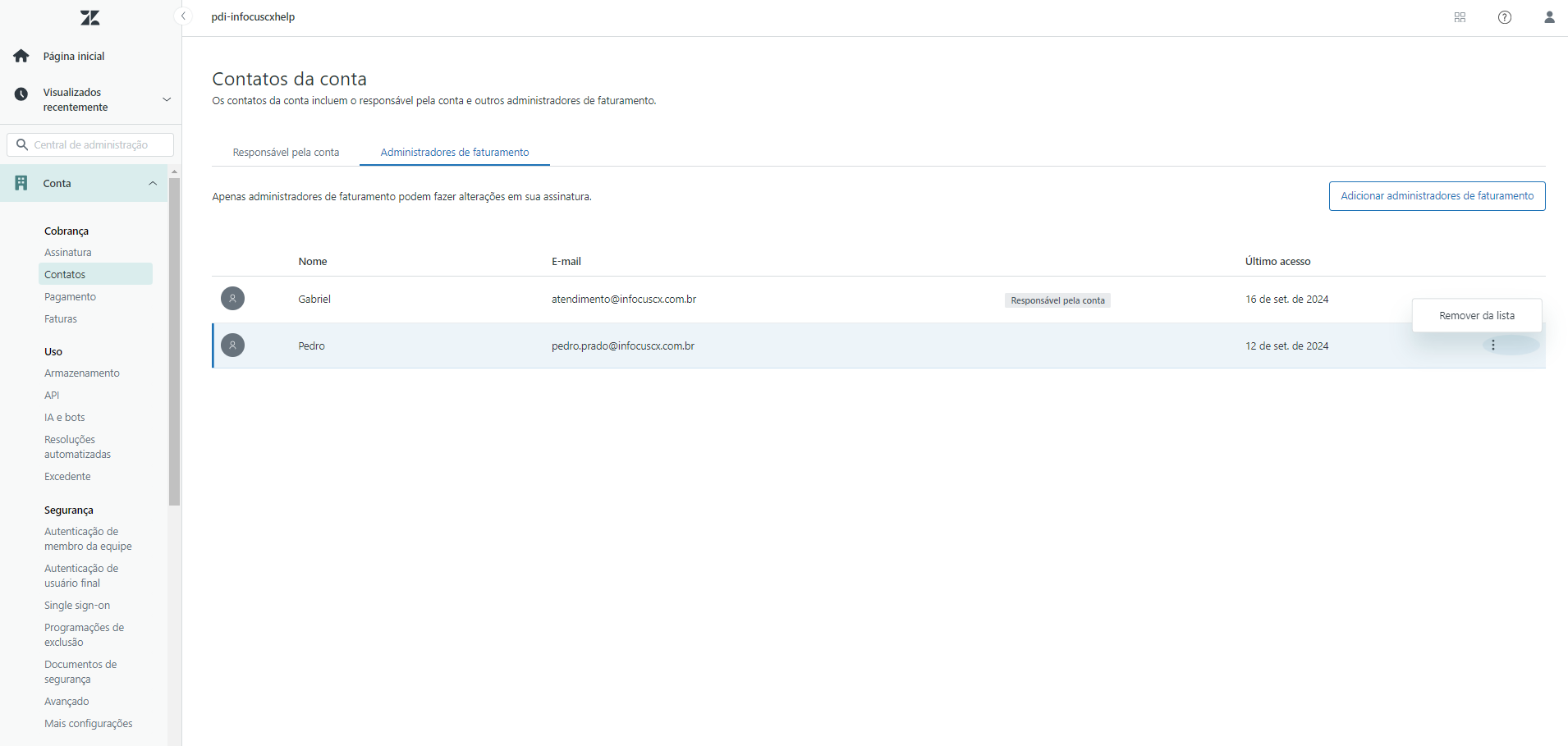 11) Caso seja necessário remover o nome de um membro de equipe da lista de administradores de faturamento, basta clicar nos 3 pontinhos ao final da linha, e selecionar Remover da lista.