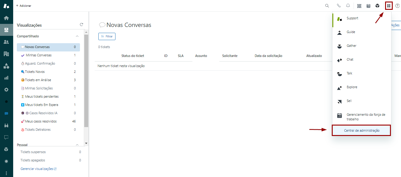 1) Inicialmente acesse o menu de Produtos Zendesk e selecione Central de Administração:
