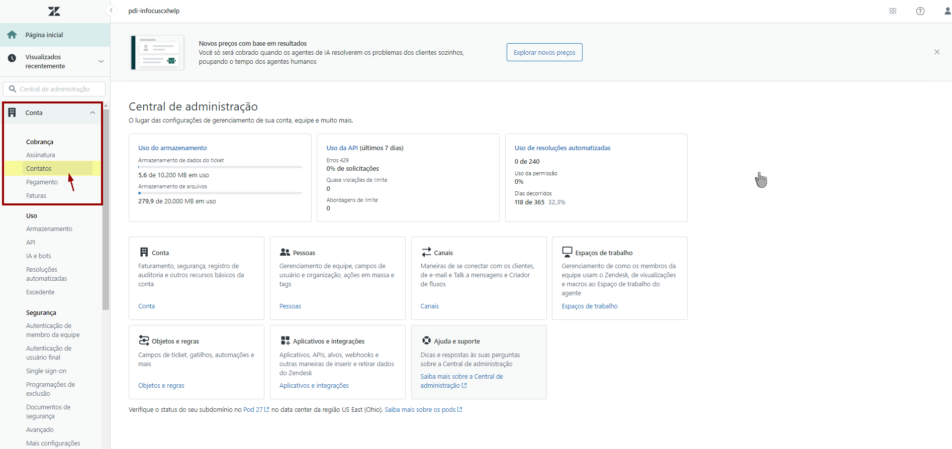 2) No menu lateral, pesquise pela trilha Conta > Cobrança > Contatos.