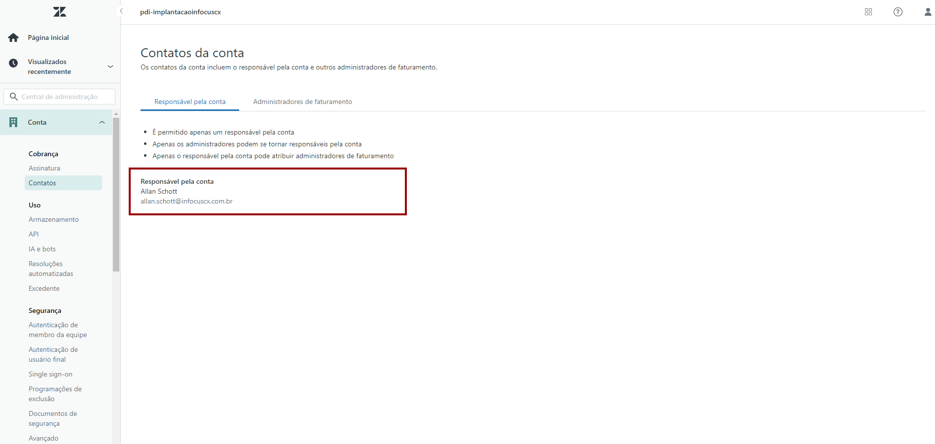 3) No menu Responsável pela conta (1) será exibido o nome do membro de equipe responsável por essa função. Se na sua instância houver apenas uma licença, o nome do único membro de equipe será apresentado também como o Responsável da conta, conforme print abaixo. Não há nenhum recurso que permita edição direta nessa tela ou o direcionamento a outros menus na Zendesk.