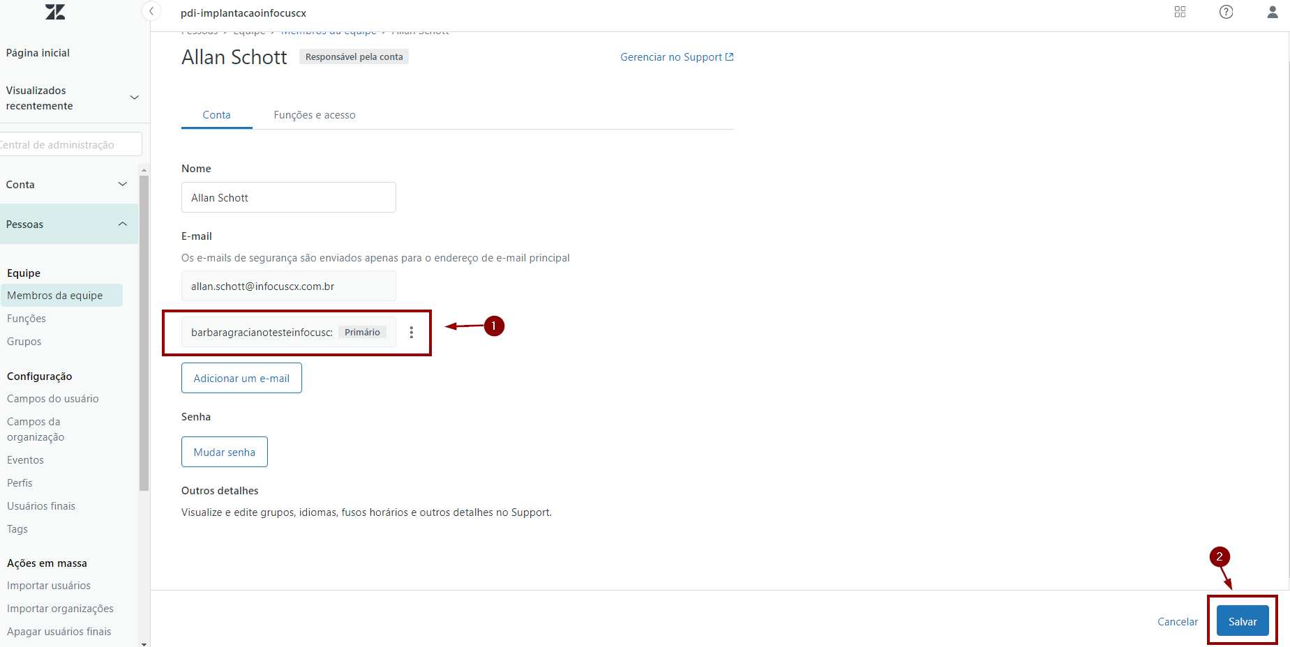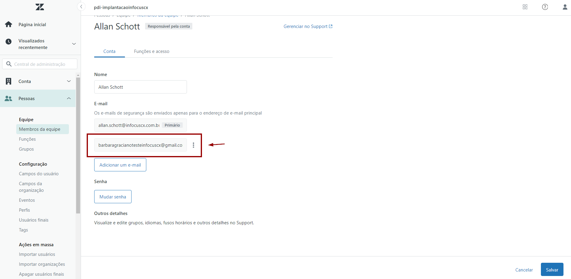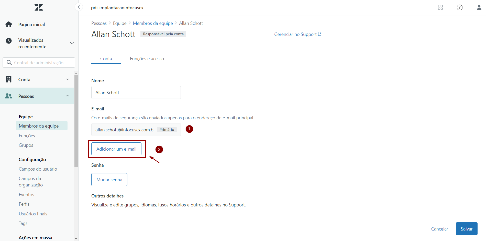 4) Nesse caso, a alteração do e-mail do único membro de equipe, que também é o responsável pela conta, será feita no perfil do membro de equipe no Support. Para isso, ainda na Central de Administração acesse a trilha Pessoas > Equipe > membros de equipe.
