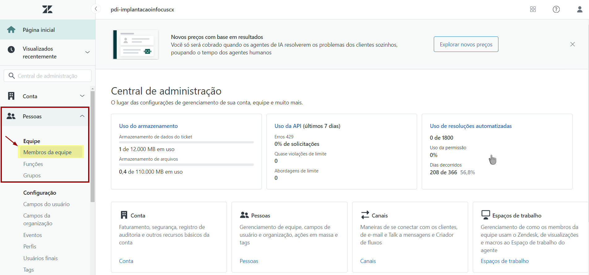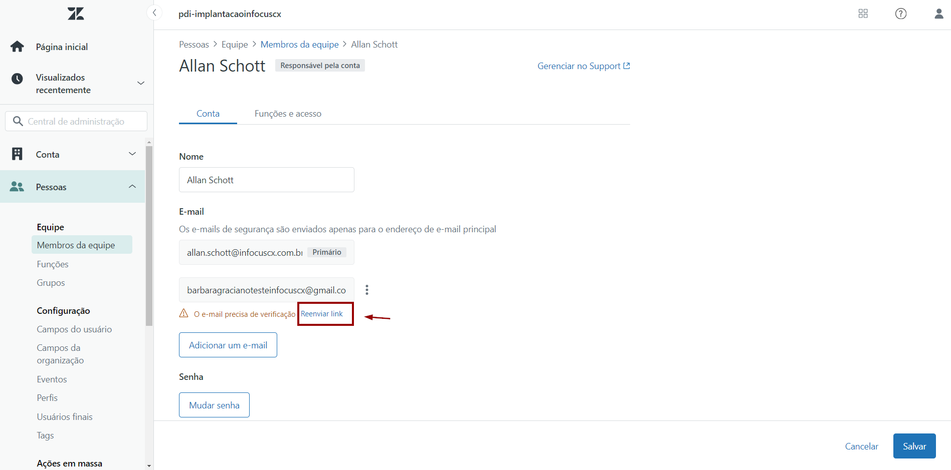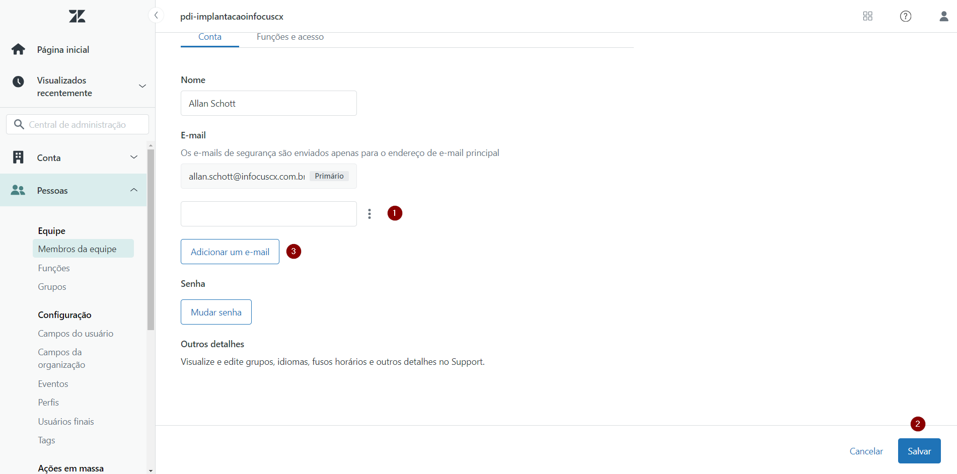 4) Nesse caso, a alteração do e-mail do único membro de equipe, que também é o responsável pela conta, será feita no perfil do membro de equipe no Support. Para isso, ainda na Central de Administração acesse a trilha Pessoas > Equipe > membros de equipe.