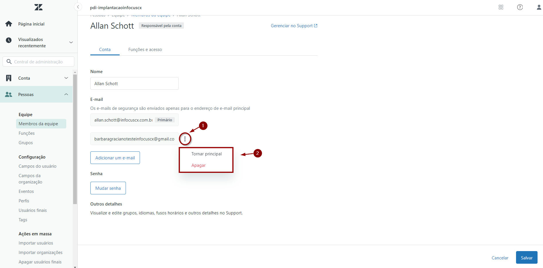 14) Por fim, para tornar o e-mail secundário em e-mail principal, clique nos 3 pontinhos ao lado do novo e-mail (1). Também será possível apagar o e-mail (2). Caso o e-mail não seja mais utilizado, utilize essa opção para excluí-lo do cadastro.