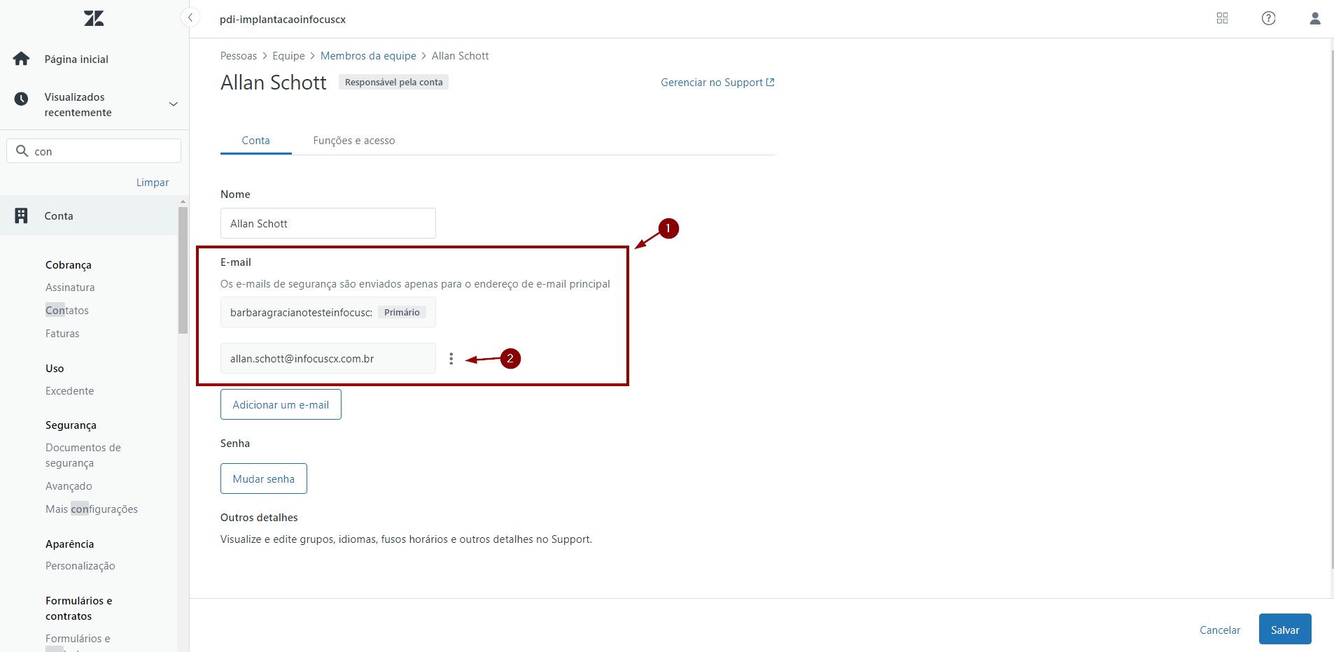 Vamos ver agora como proceder quando for necessário alterar o nome/perfil do Responsável da Conta, ou alterar o e-mail cadastrado para esse membro de equipe, quando a instância possuir mais licenças contratadas, e mais administradores como membros de equipe.