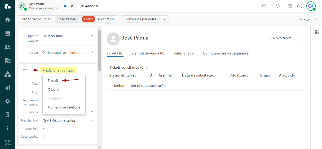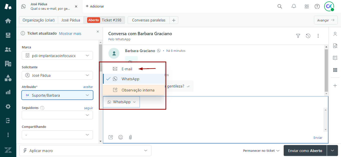 - Clique na ID do ticket para exibi-lo novamente, e ao lado do menu WhatsApp, clique na seta para alternar a comunicação para o canal E-mail.