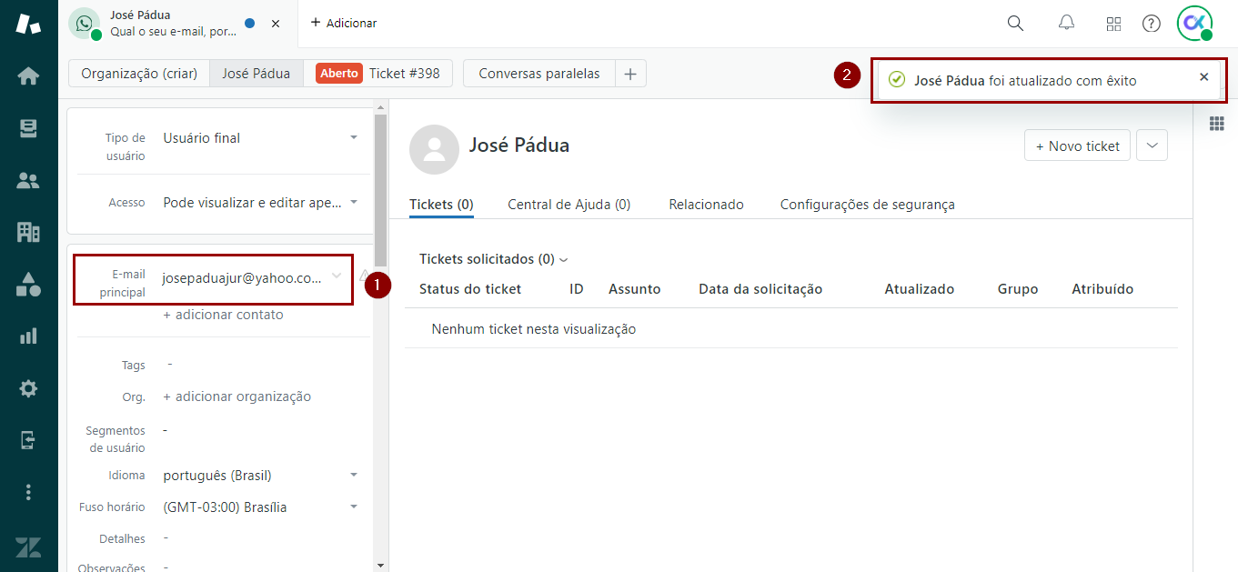 - Confirme o e-mail do cliente, e atualize o cadastro no campo do perfil do solicitante no ticket: