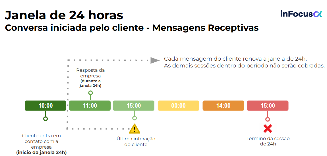 - A empresa consegue interagir com o cliente dentro de uma janela de 24 horas, que é inaugurada a partir da primeira mensagem enviada pelo cliente, e renovada por mais 24 horas a cada nova interação que ele realiza com o agente.