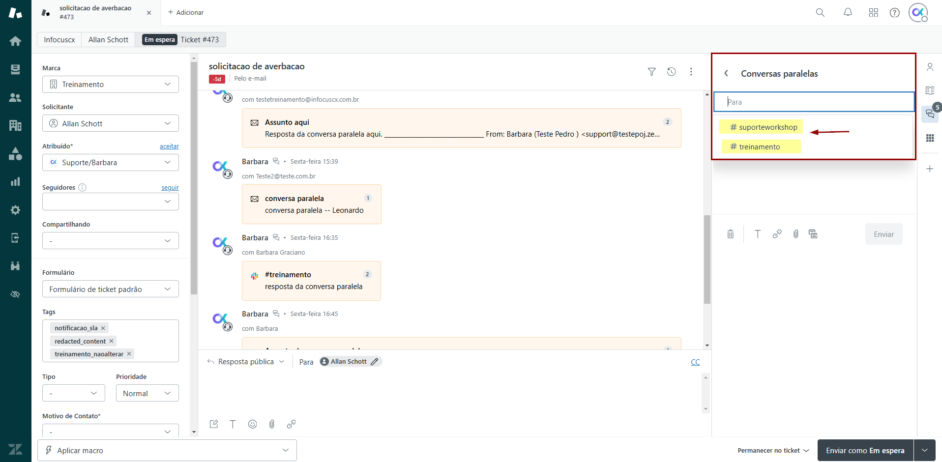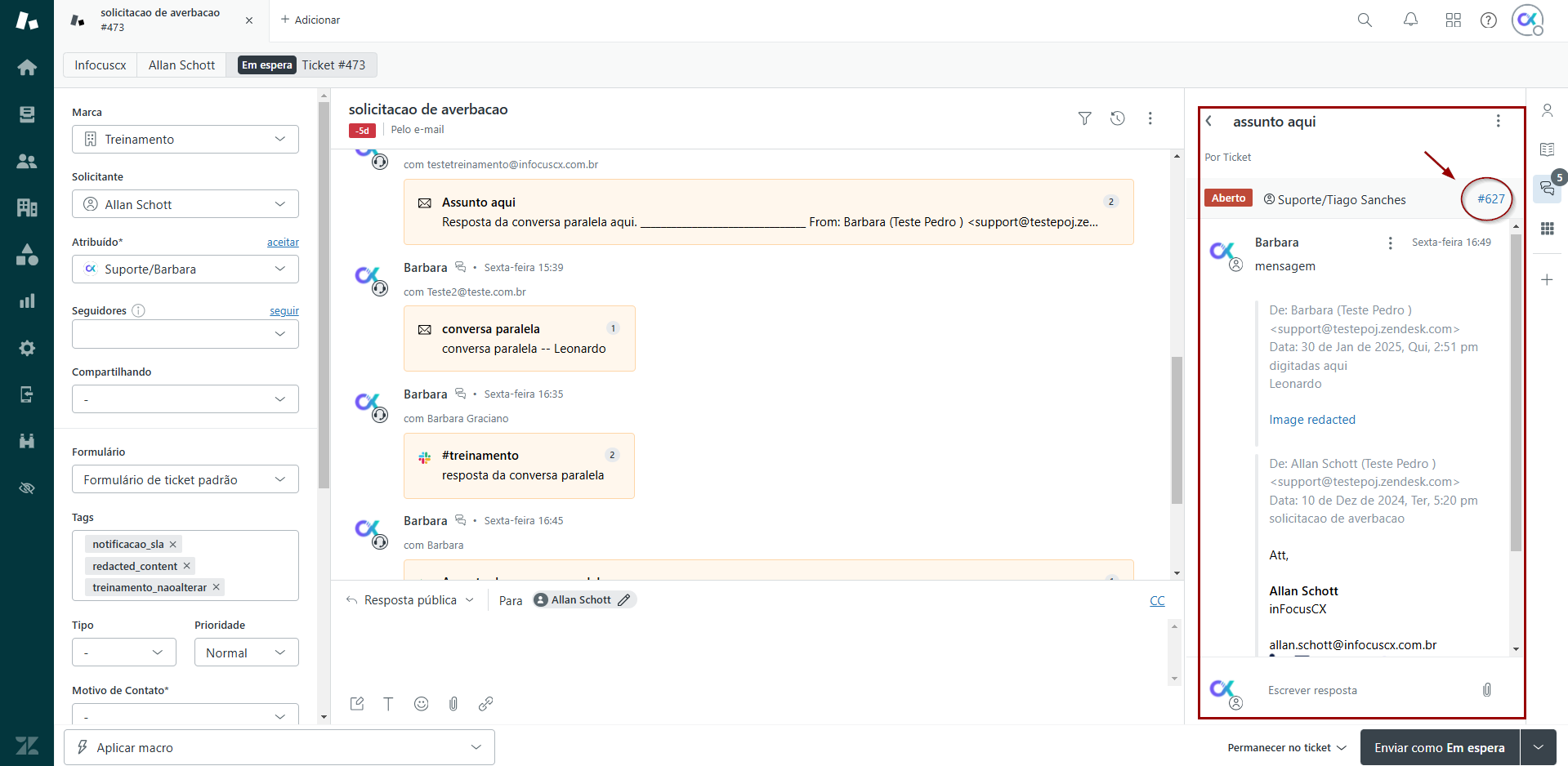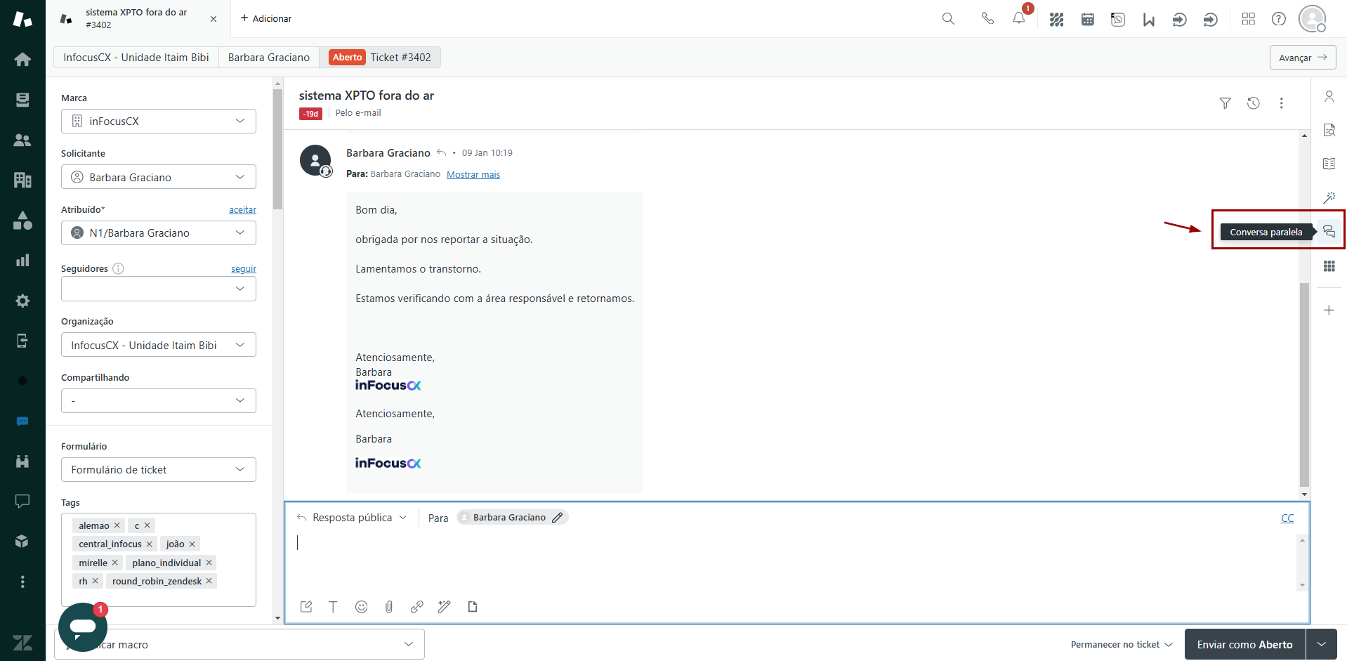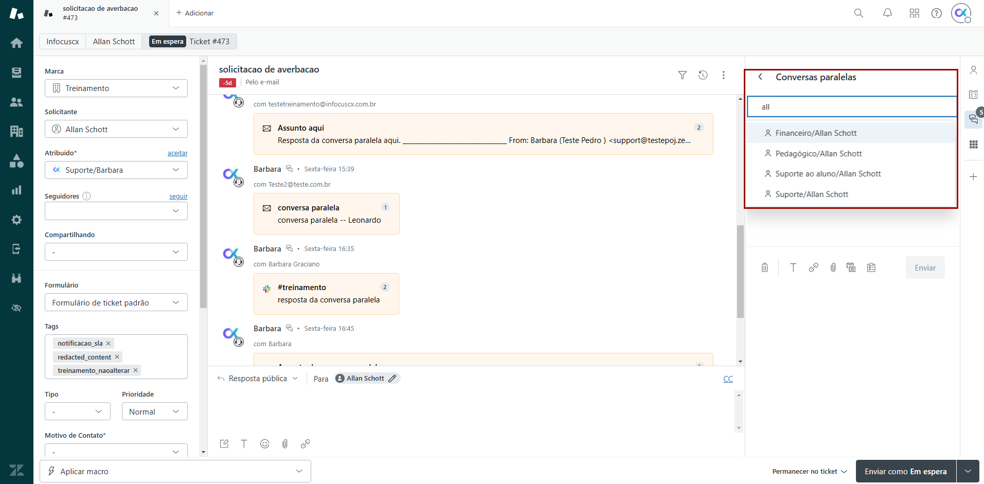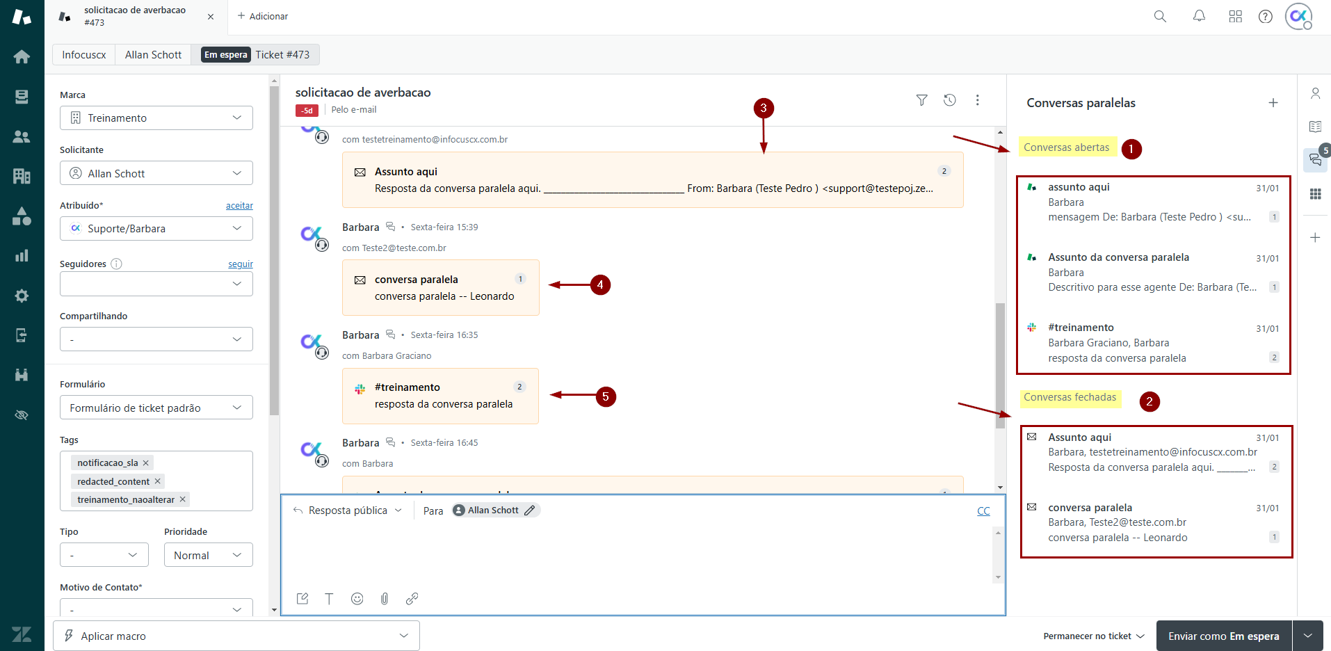 4) A utilização das Conversas Paralelas é bastante recomendada devido à sua dinâmica eficiente associada aos gatilhos. Na prática, quando uma ou mais conversas paralelas forem respondidas, o status do ticket Em Espera será alterado para Em Aberto, chamando a atenção do agente e eliminando o esforço de uma conferência manual.