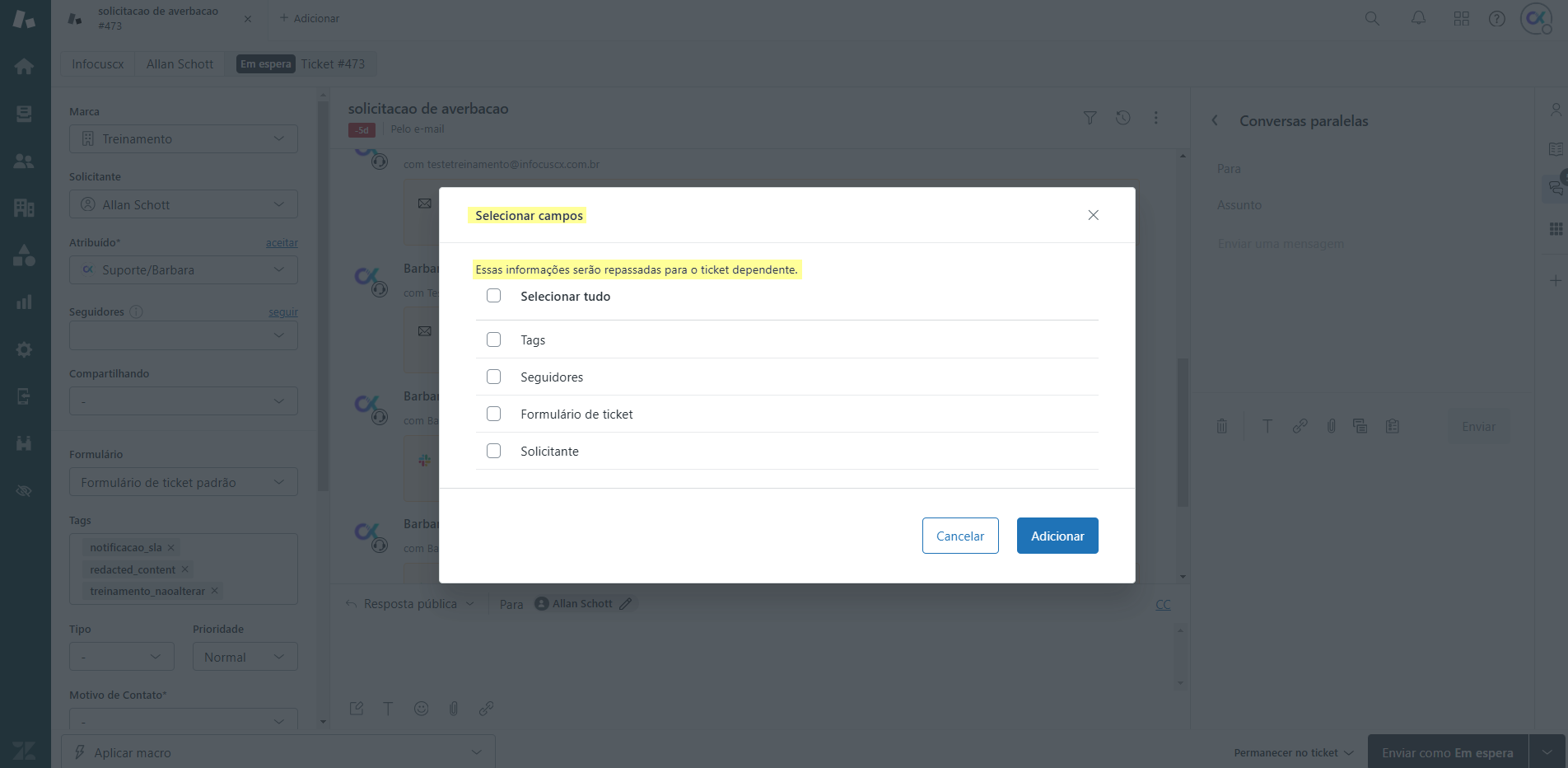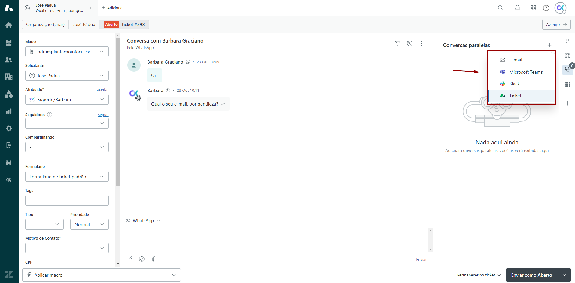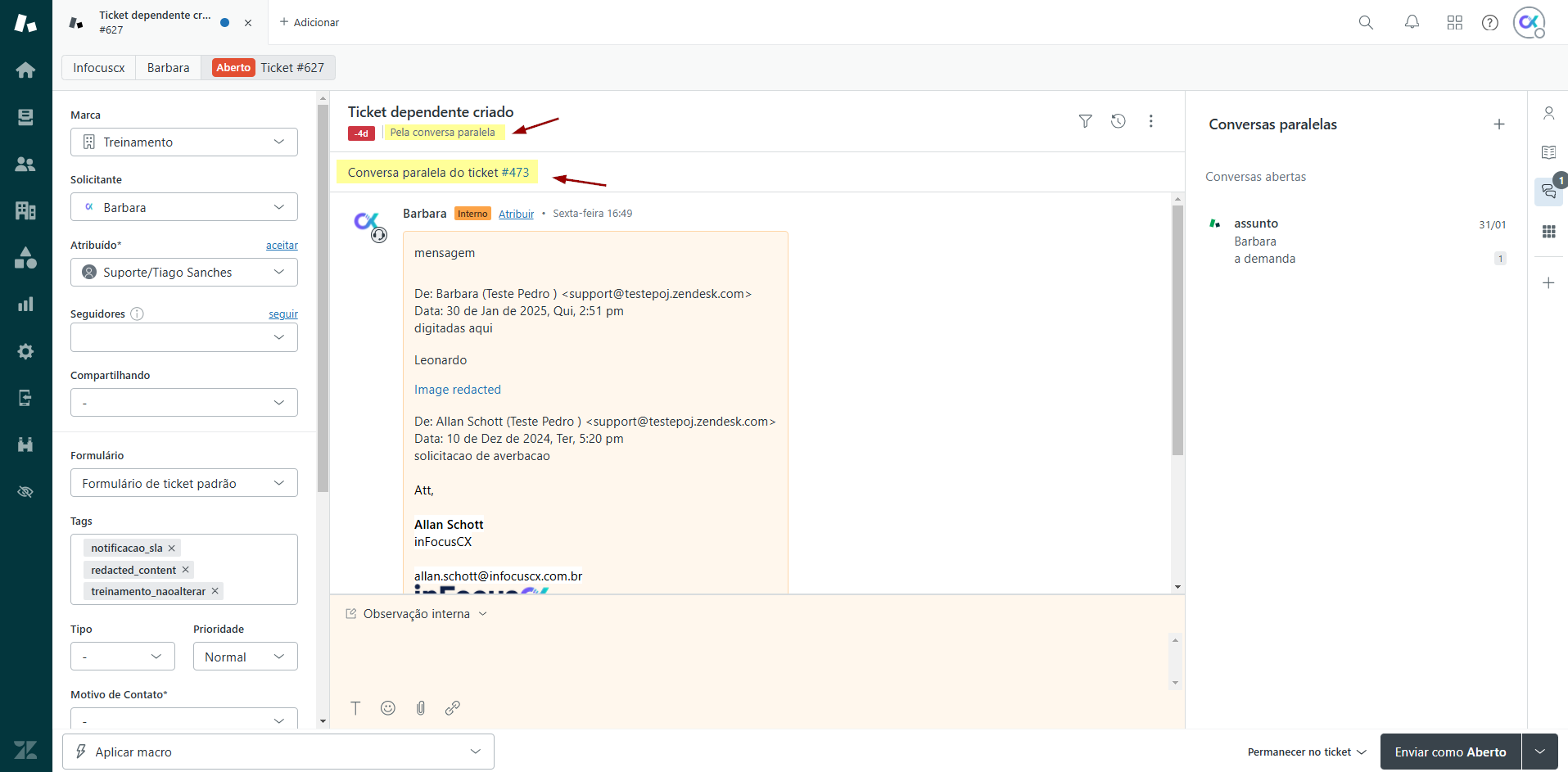 9) Quando o outro grupo/agente acessar o ticket dependente, ele terá a referência de que o ticket foi originado de uma conversa paralela.