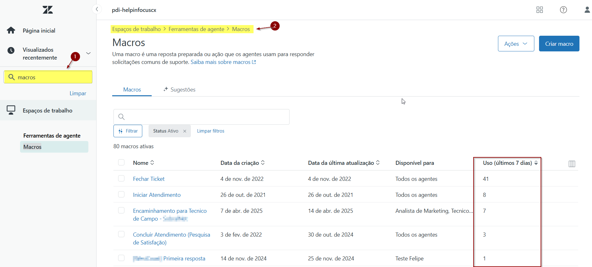 Na Central de Administração é possível verificar quais são as macros mais utilizadas pelas equipes de atendimento, e usar esse dado para gerar insights sobre dificuldades comuns dos clientes. Dessa forma, as macros que abordam problemas conhecidos e soluções alternativas podem ser convertidas em pautas para artigos de ajuda.