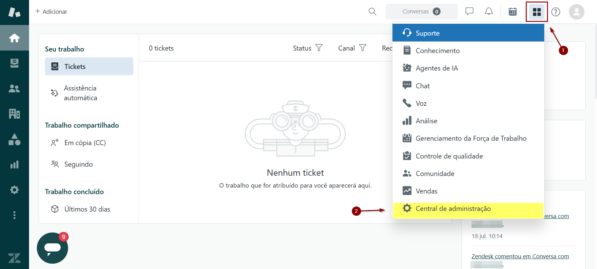 1) Acesse o menu de Produtos Zendesk e selecione Central de Administração: