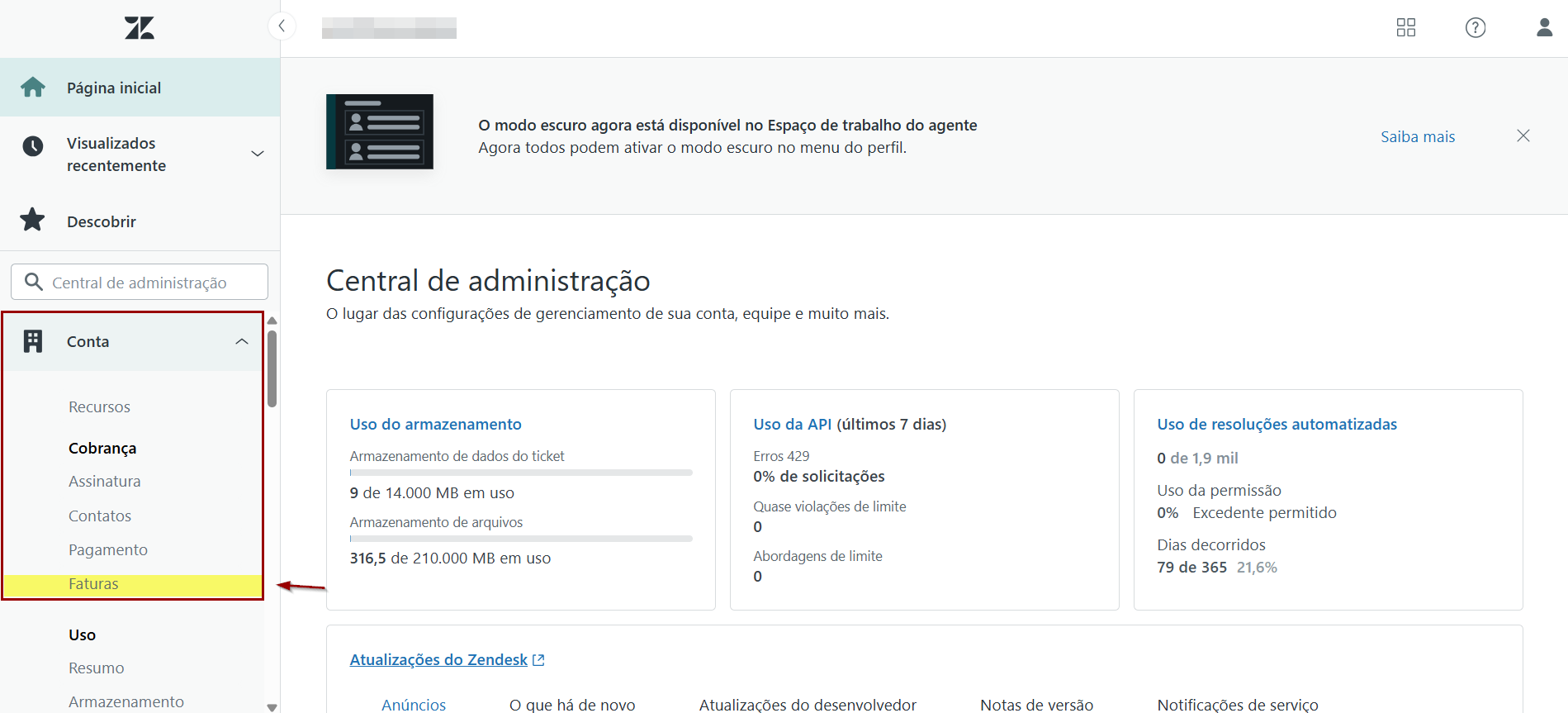 As invoices (faturas) da sua assinatura com a Zendesk podem ser encontradas dentro de sua instância Zendesk, e tanto o acesso quanto o download estão restritos ao responsável pela conta ou um administrador de faturamento.