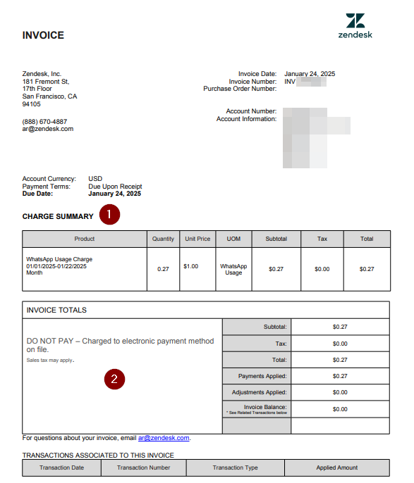 4) Selecione a fatura desejada e clique no ícone de download para visualizar ou baixar. O resumo da cobrança será indicado (1), assim como as instruções de pagamento (2), incluindo as informações para transferência bancária da Zendesk (quando aplicado).