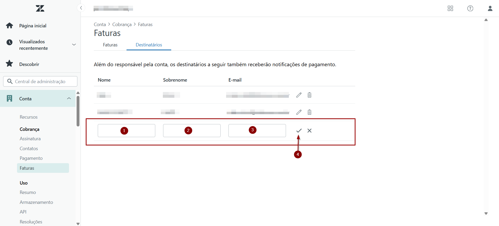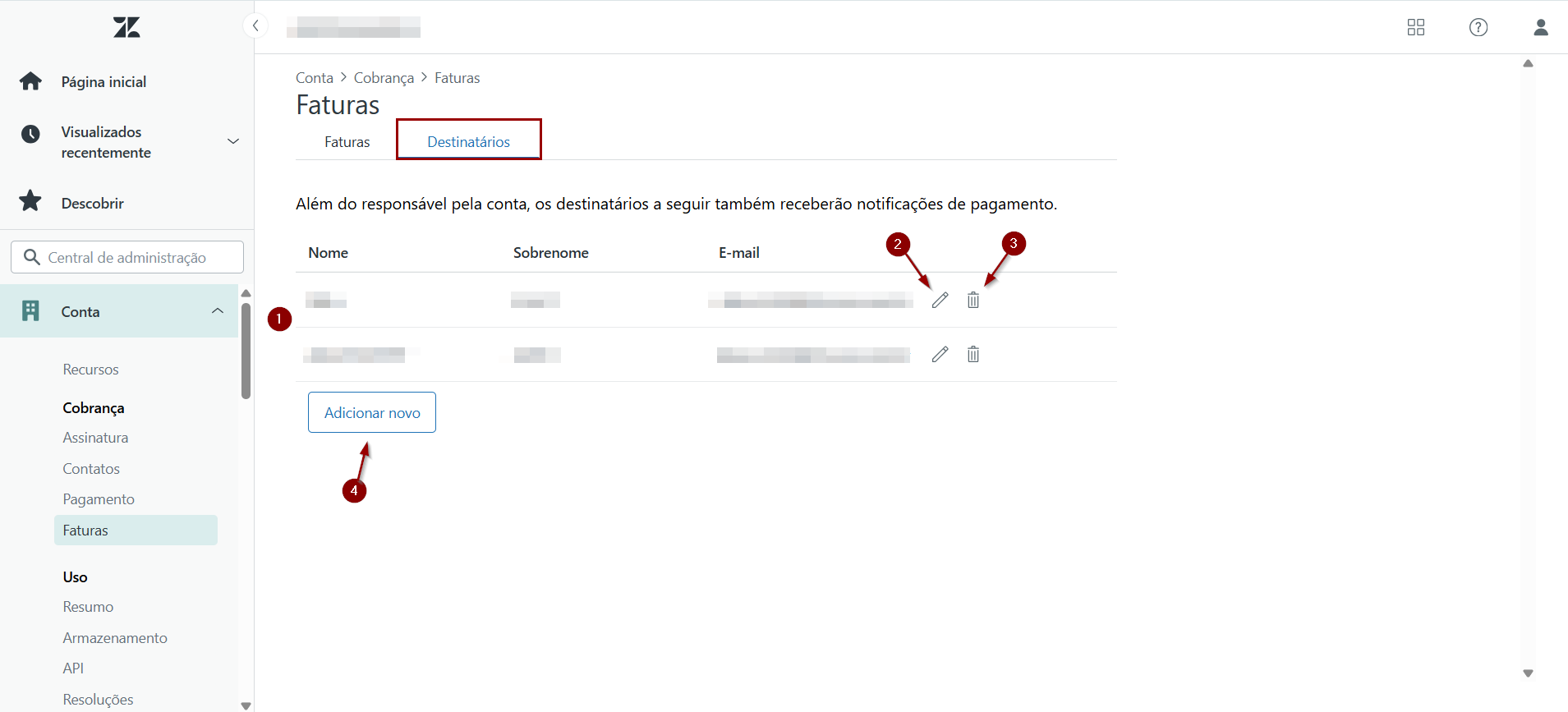 Por padrão, o responsável pela conta já recebe a fatura da Zendesk por e-mail. Caso seja necessário incluir outros destinatários no recebimento da fatura, basta cadastrá-los na Central de Administração. Vejamos: