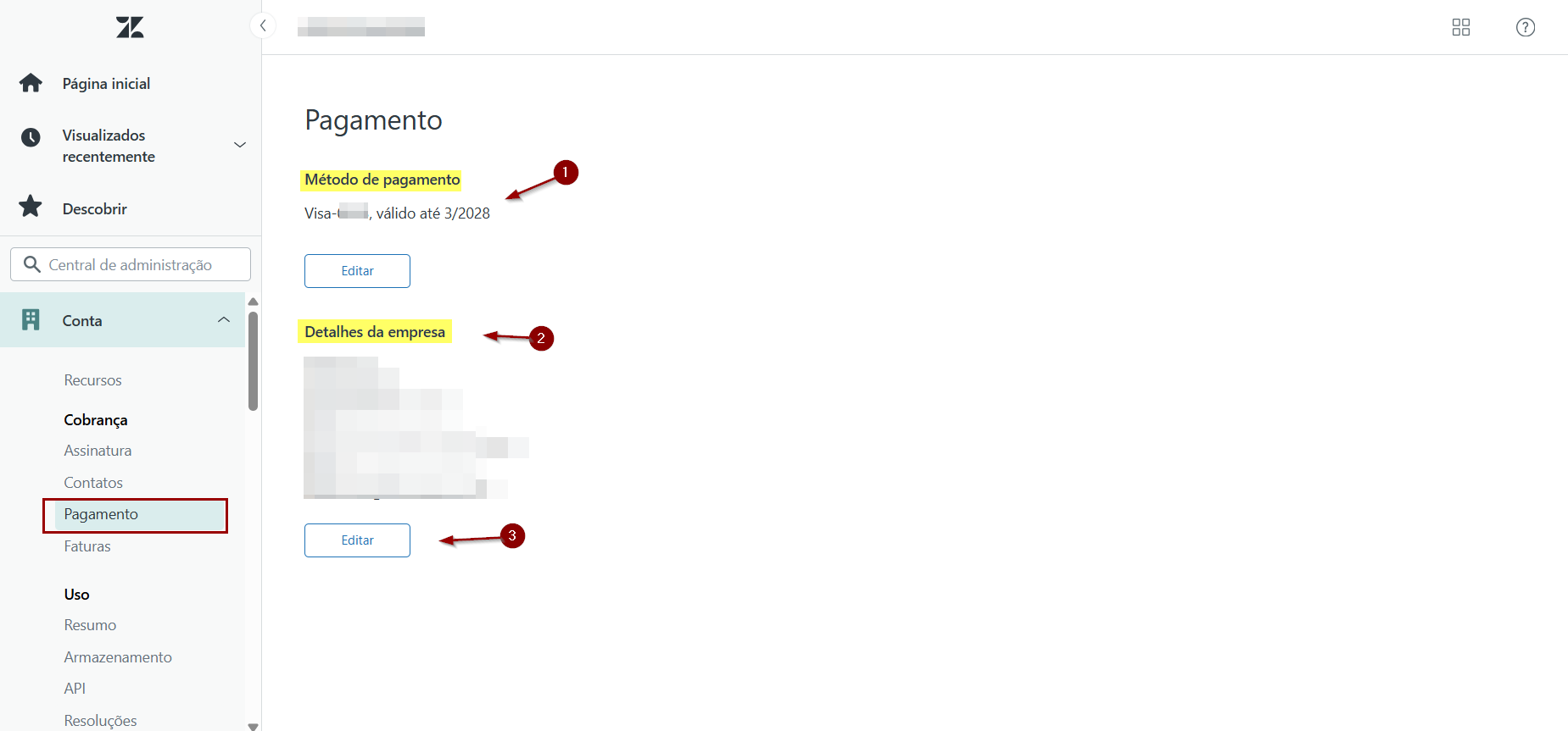 3) Em pagamento será possível atualizar tanto o método de pagamento (1) quanto os detalhes da empresa (2). Para alterar o método de pagamento cadastrado, consulte o nosso artigo Como inserir dados de cartão na Zendesk. Para editar o endereço da fatura, clique em Editar (3).
