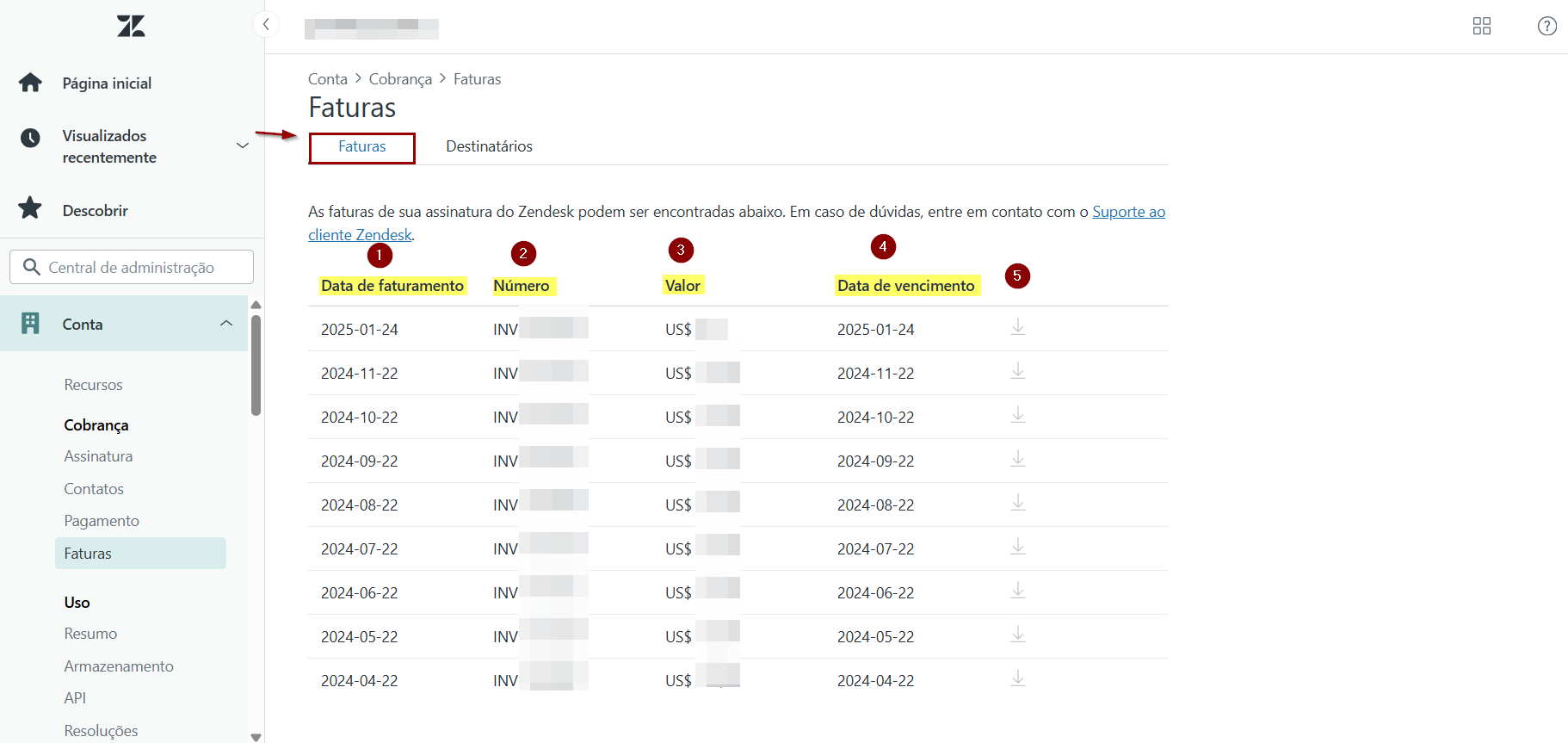 3) Todas as faturas do seu contrato com a Zendesk serão exibidas em uma tabela, conforme a data de faturamento (1), o número da invoice (2), o valor (3), data de vencimento (4) e a coluna específica para baixar cada invoice (5).