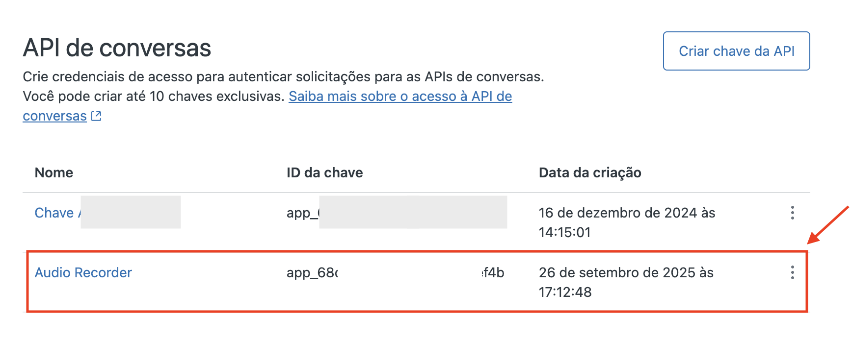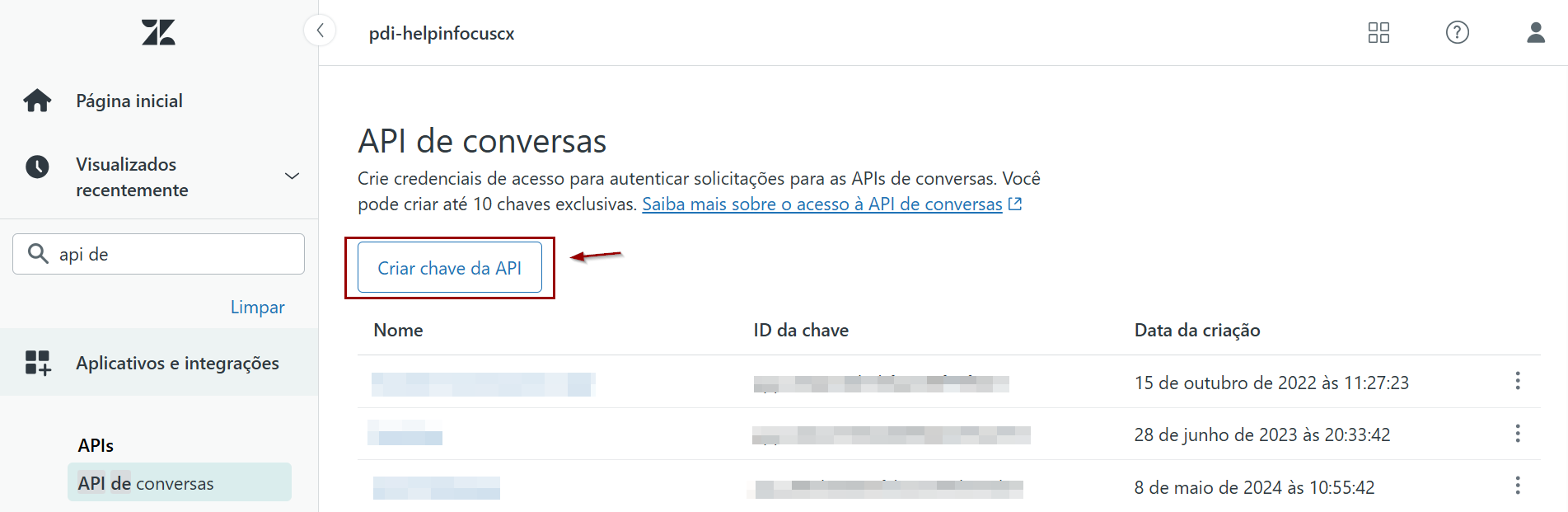 2) Na página de API de conversas, clique no botão Criar chave da API.