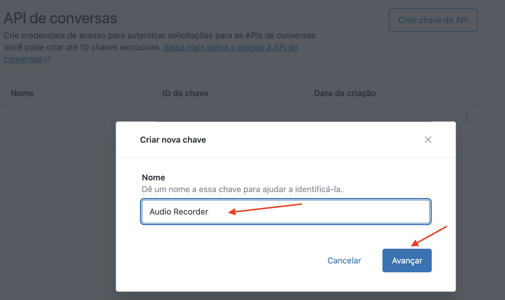 3) Na janela aberta, preencha com o nome Audio Recorder para ajudar na identificação da chave em questão. Clique em avançar.
