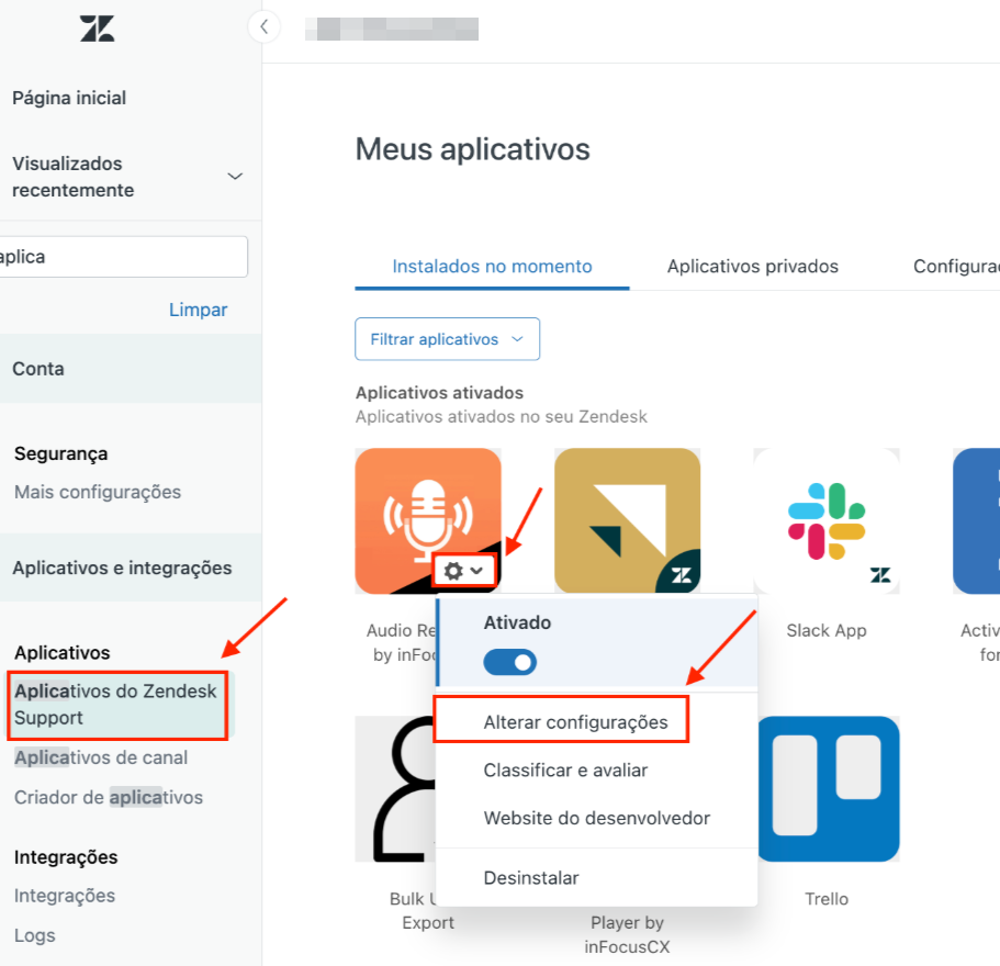 6) Retorne à Central de Administração da Zendesk, e no menu digite Aplicativos do Zendesk Support. Ao acessá-lo, localize o app Audio Recorder by inFocusCX já instalado em sua conta. Clique no ícone do app e selecione a opção Alterar configurações.