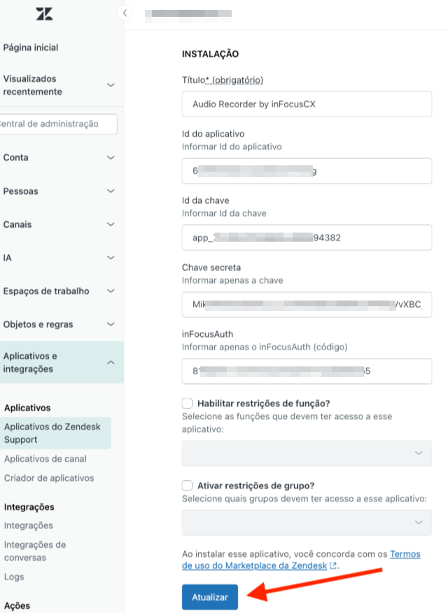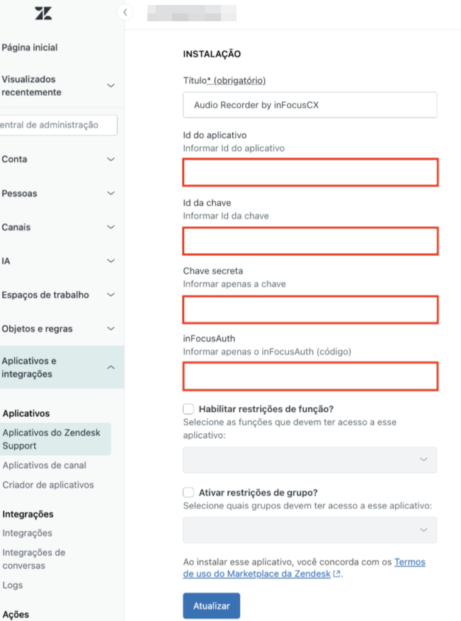 Os campos ID do Aplicativo, ID da Chave e Chave Secreta serão gerados em sua instância Zendesk.