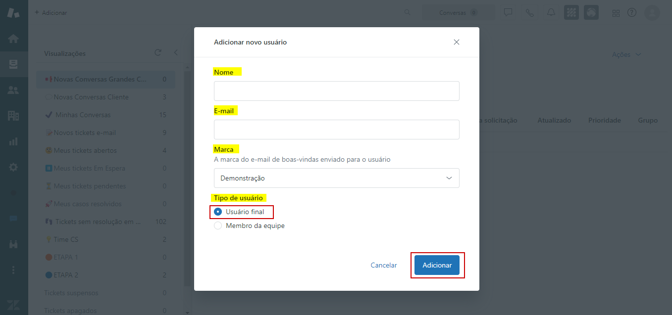 2) Adicione o nome do usuário, o e-mail e o tipo do usuário. Se o perfil em questão for para o cliente, selecione o tipo Usuário final. Em seguida, clique em Adicionar.