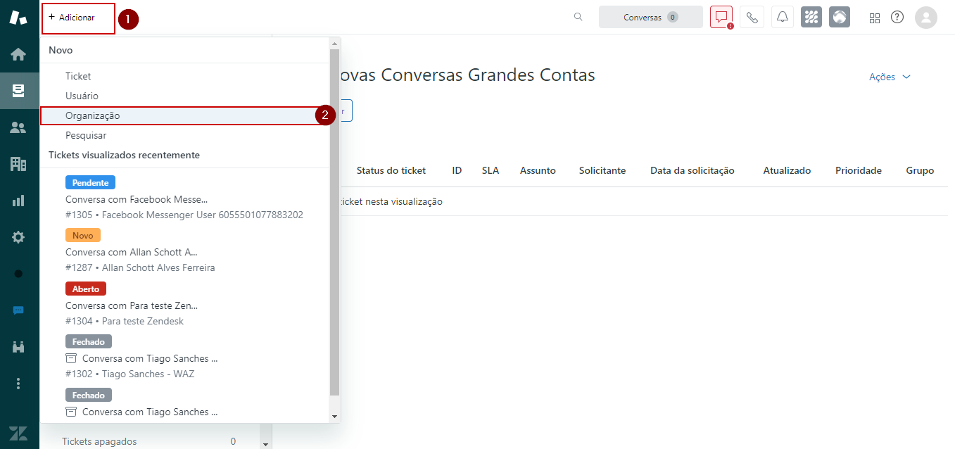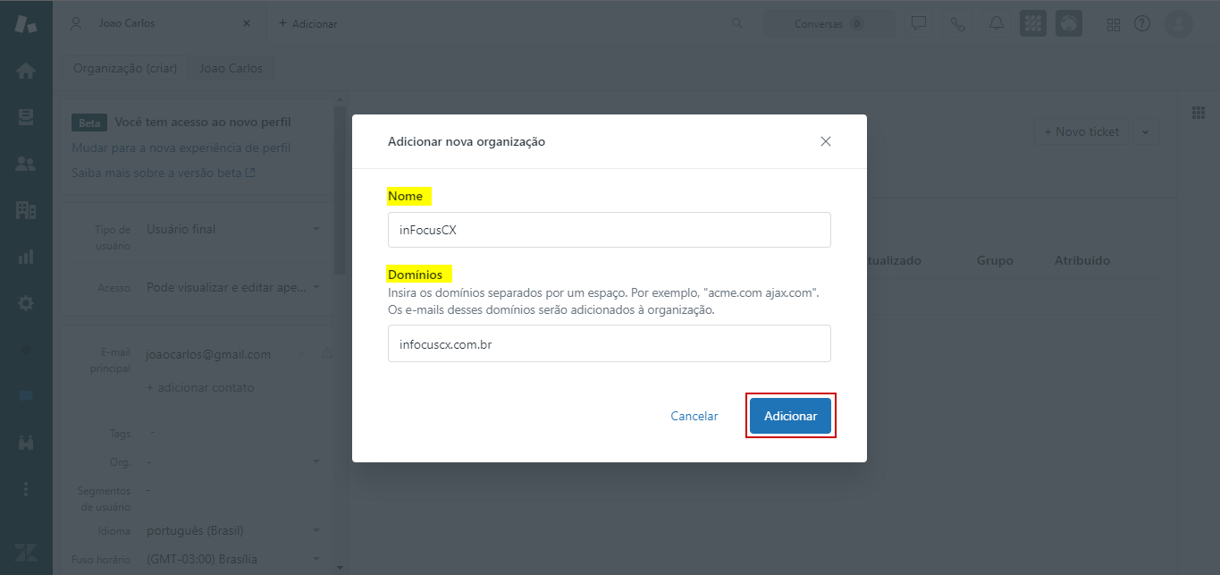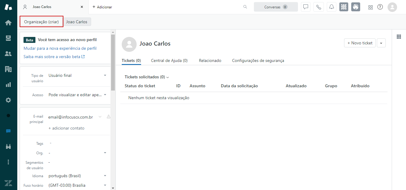 4) Ao adicionar o usuário, a Zendesk exibirá a tela do novo perfil criado. É possível adicionar nova organização na opção Organização (criar).