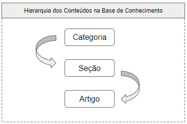 A Base de Conhecimento possui uma estrutura padrão para organização dos conteúdos. Os Artigos com as informações sobre o negócio estão vinculados a uma Seção, que por sua vez está subordinada a uma Categoria. Dessa forma, é possível realizar a criação de categorias distintas, e em cada uma delas, seções específicas, contendo um conjunto de artigos sobre determinado assunto.