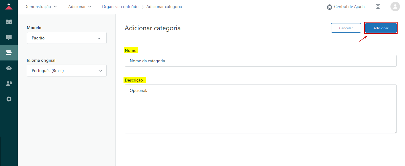 5) Digite o nome desejado para a Categoria e a sua descrição (caso necessário). Na sequência, clique em Adicionar para salvar a nova categoria.