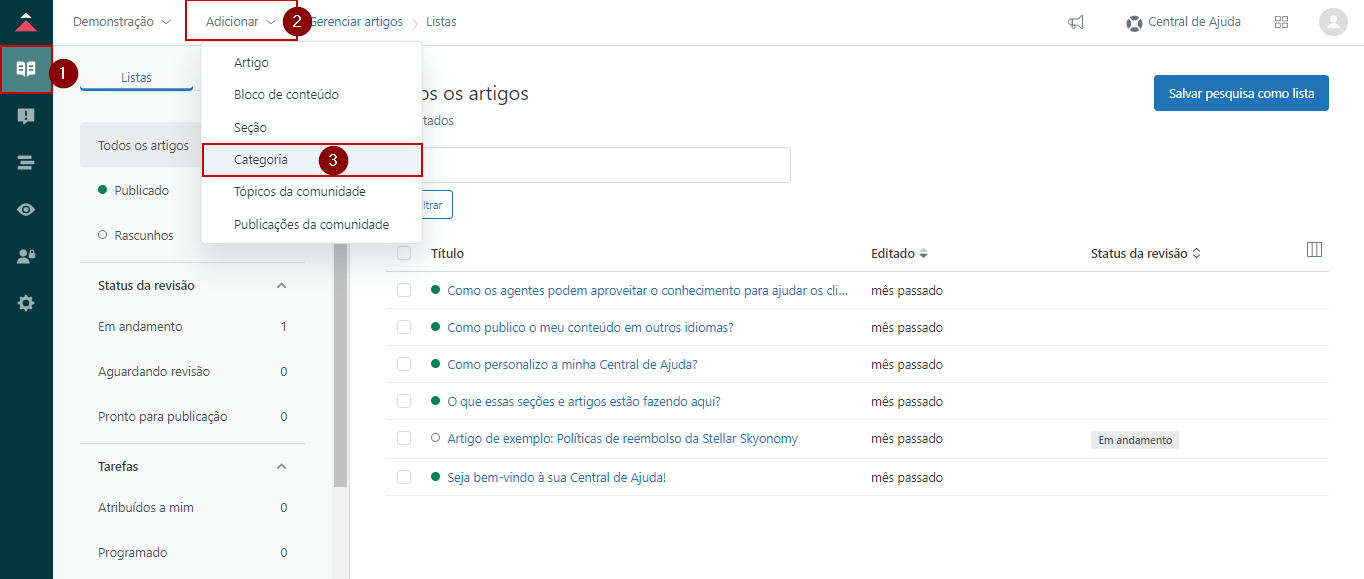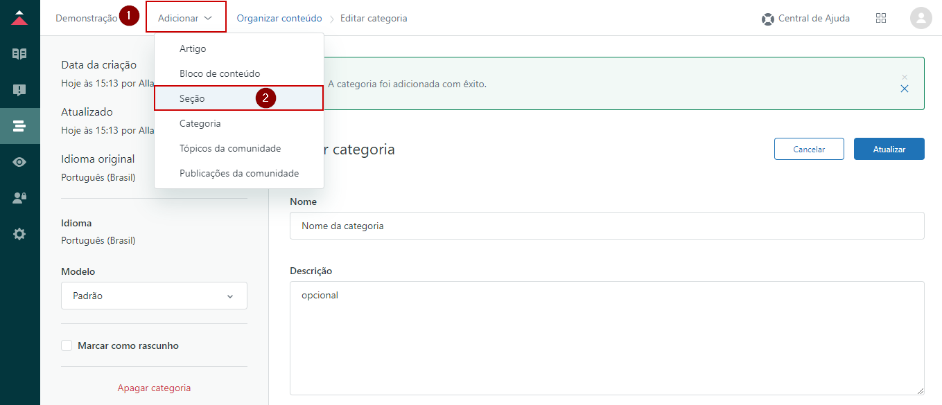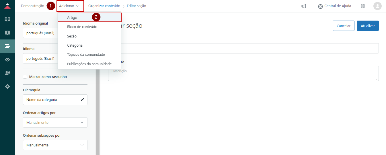 4) Clique no menu lateral Gerenciar Artigos, e depois em Adicionar. Selecione a opção Categoria.