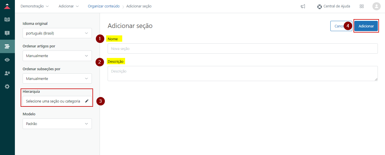 7) Digite o nome desejado para a Seção e a sua descrição (opcional). No menu lateral Hieraquia selecione a categoria na qual a Seção estará vinculada. Para concluir a criação da Seção, clique em Adicionar.