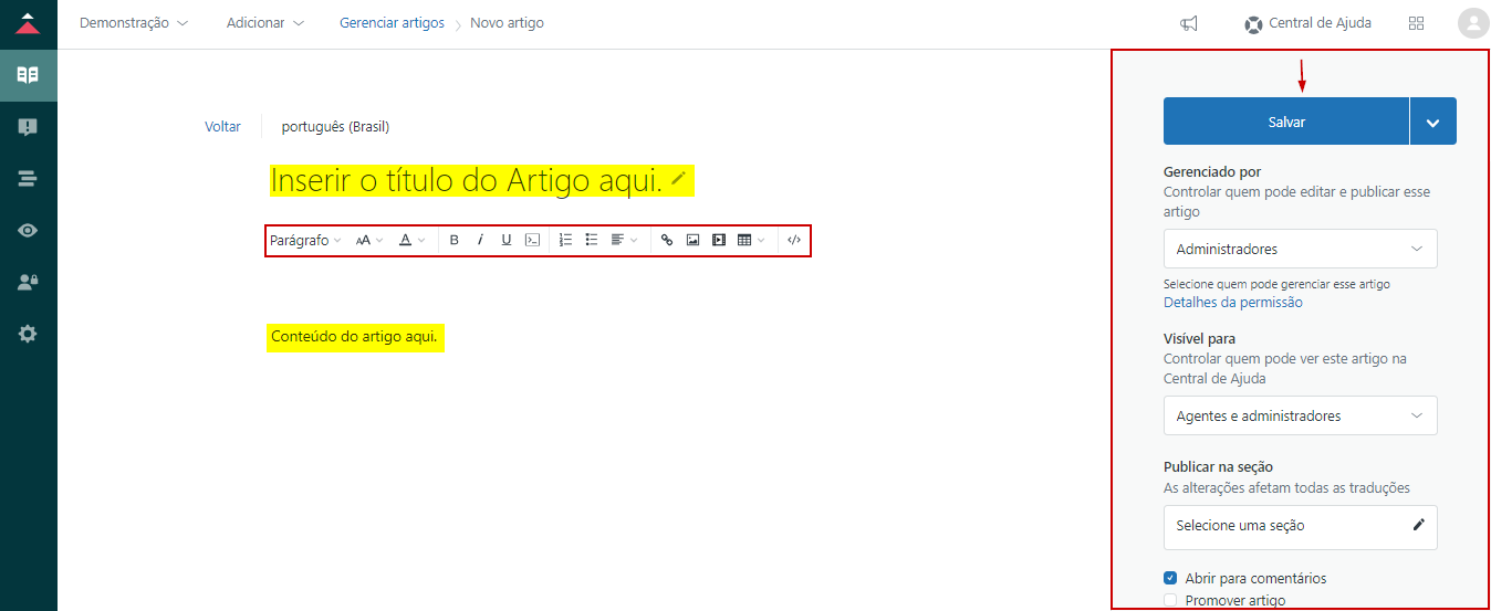 9) Na etapa de criação do Artigo, será possível inserir o conteúdo e o título, realizar a formatação do texto, inserir imagens/vídeos, entre diversas outras funcionalidades. O painel lateral permite ajustar o controle de quem pode editar, publicar e visualizar o artigo. Também é possível definir em que seção o artigo será salvo, a identificação do autor e responsável pelo conteúdo. Feitas as configurações desejadas, clique em Salvar.
