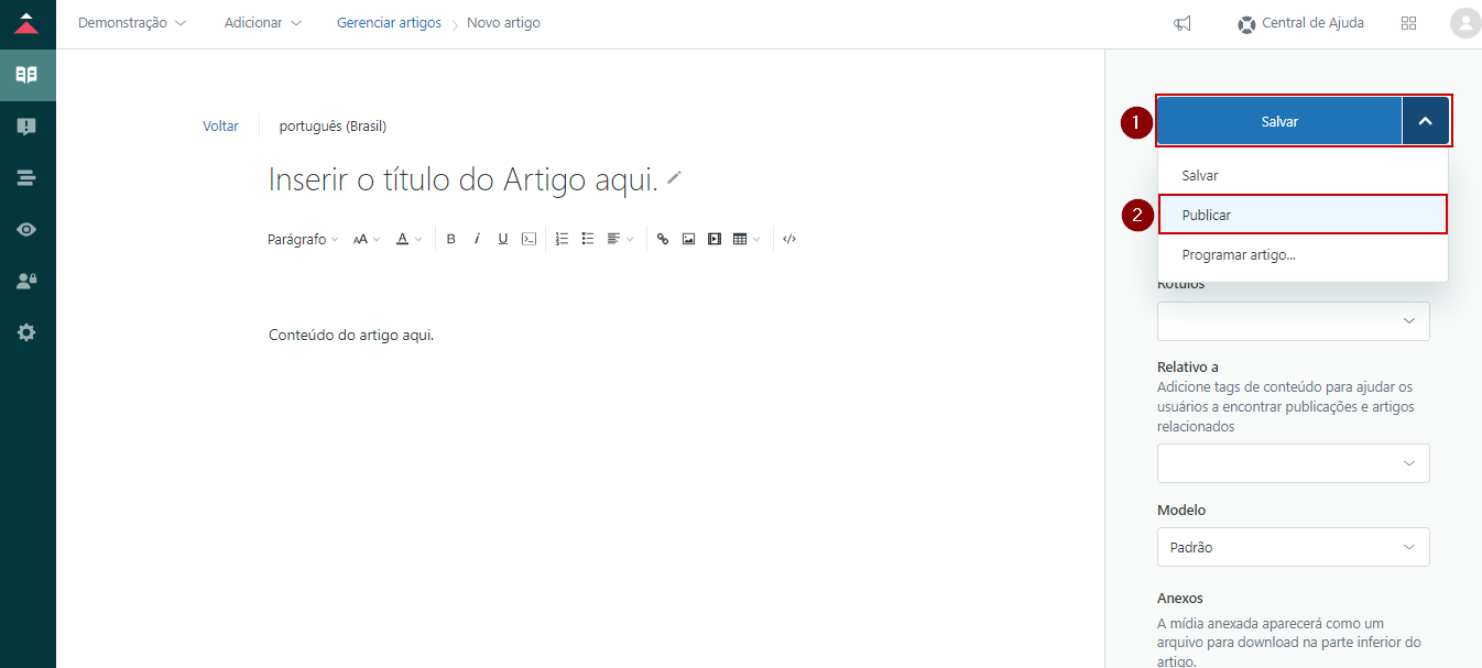 10) Após salvar o conteúdo do Artigo, o próximo passo é realizar a sua publicação na Central de Ajuda. Clique na seta ao lado do botão Salvar, e escolha a opção Publicar.